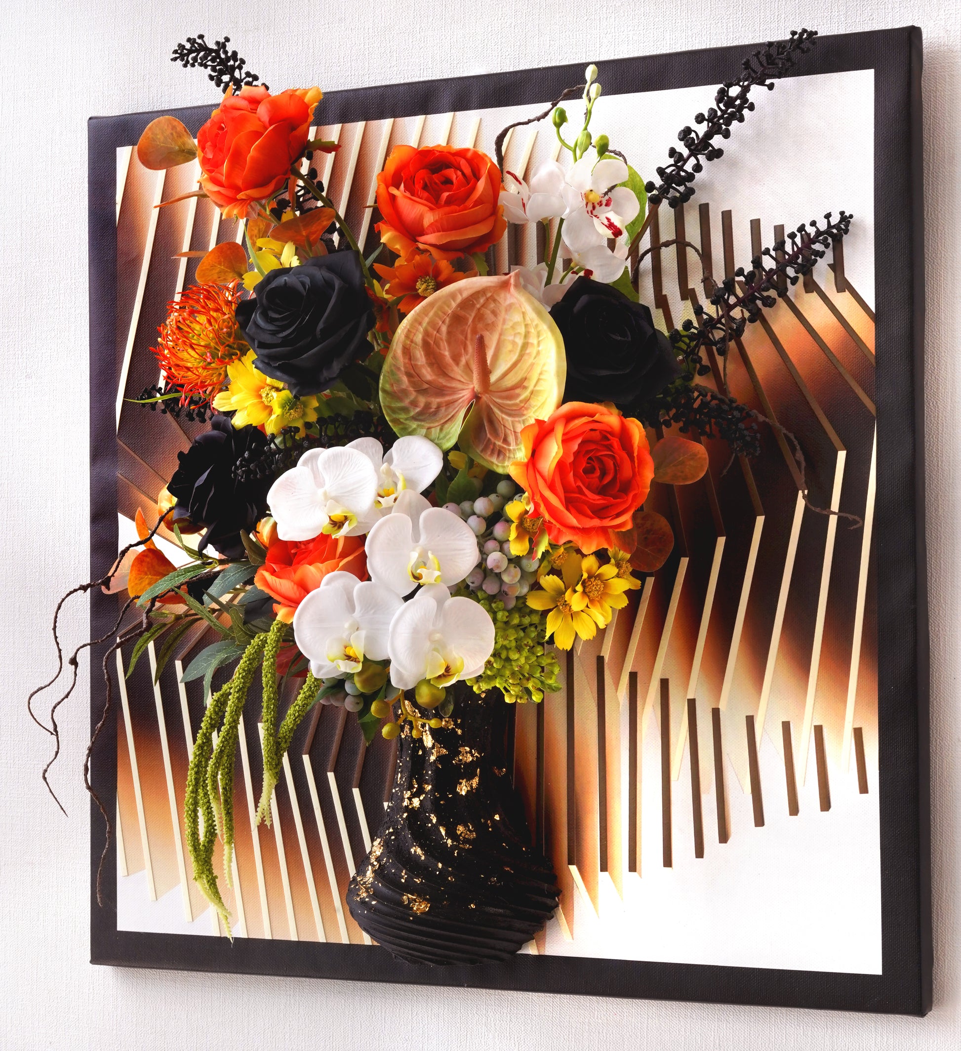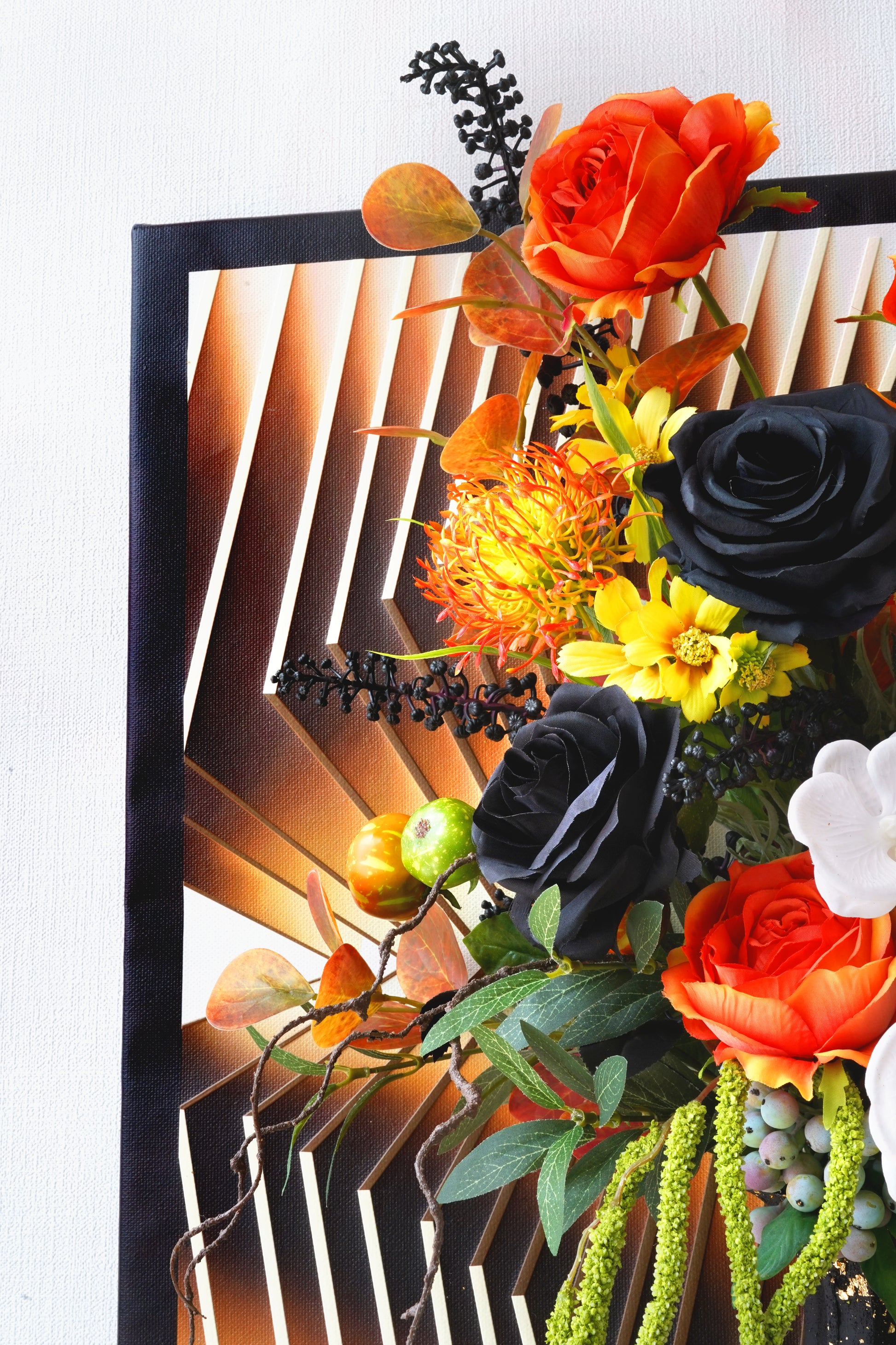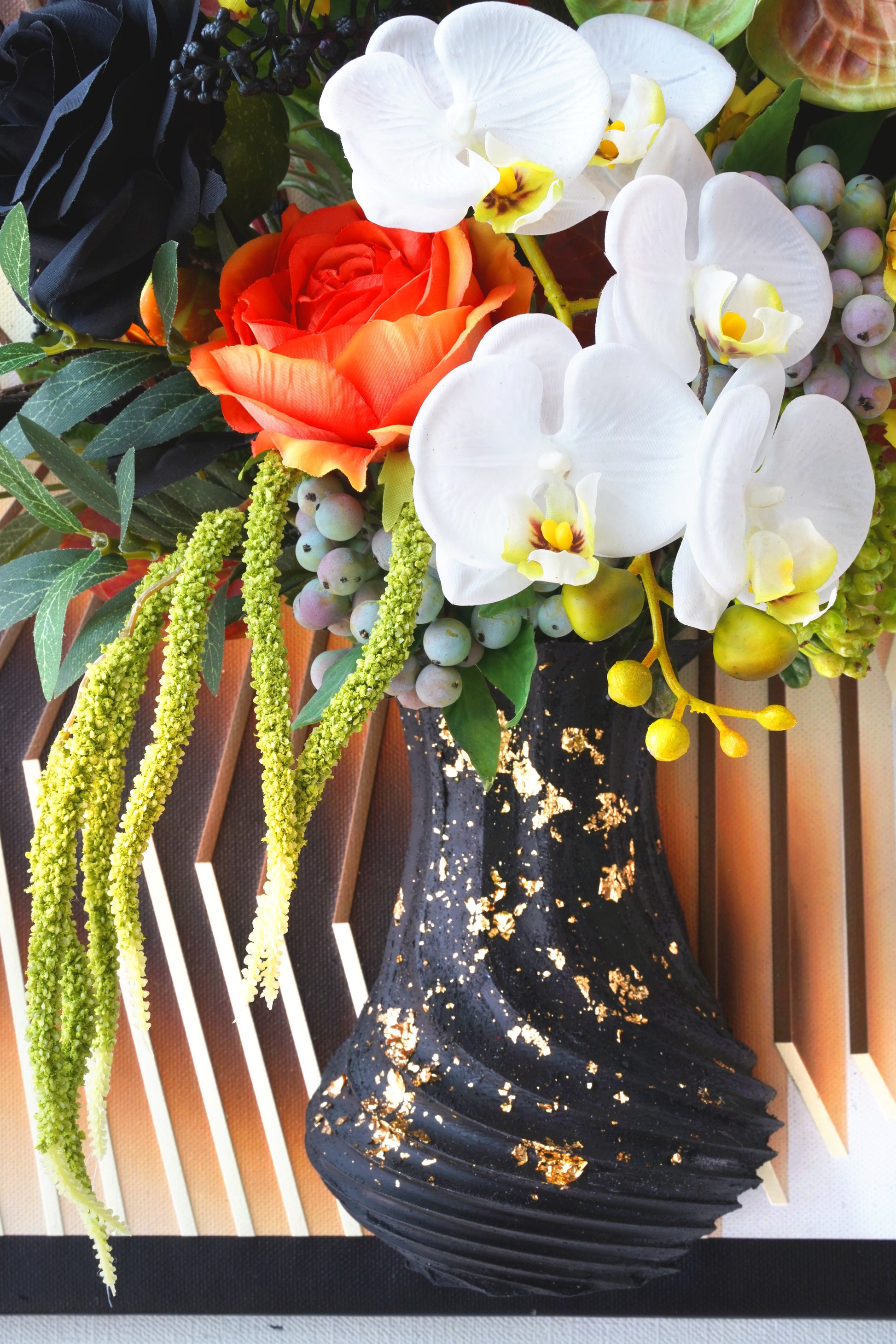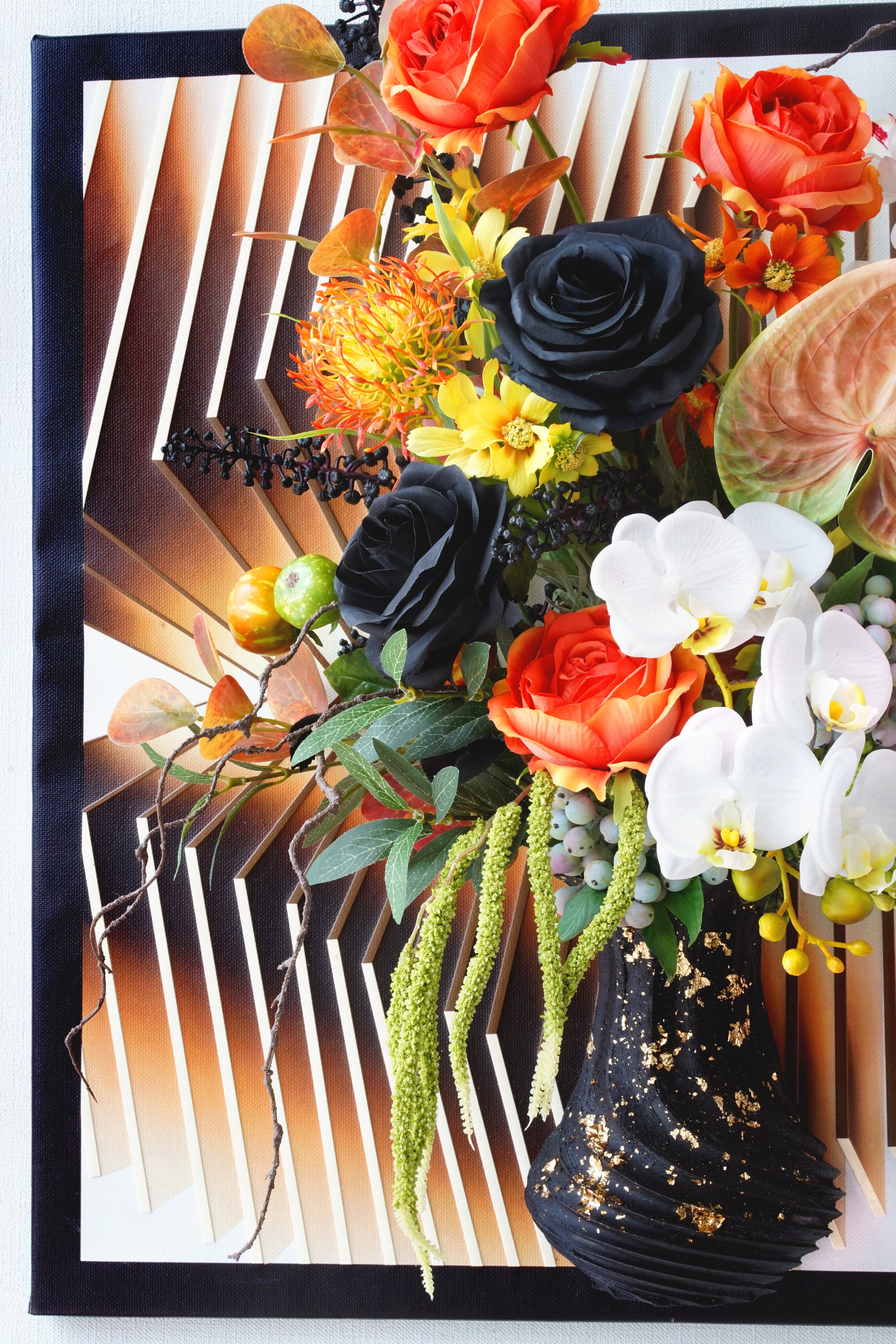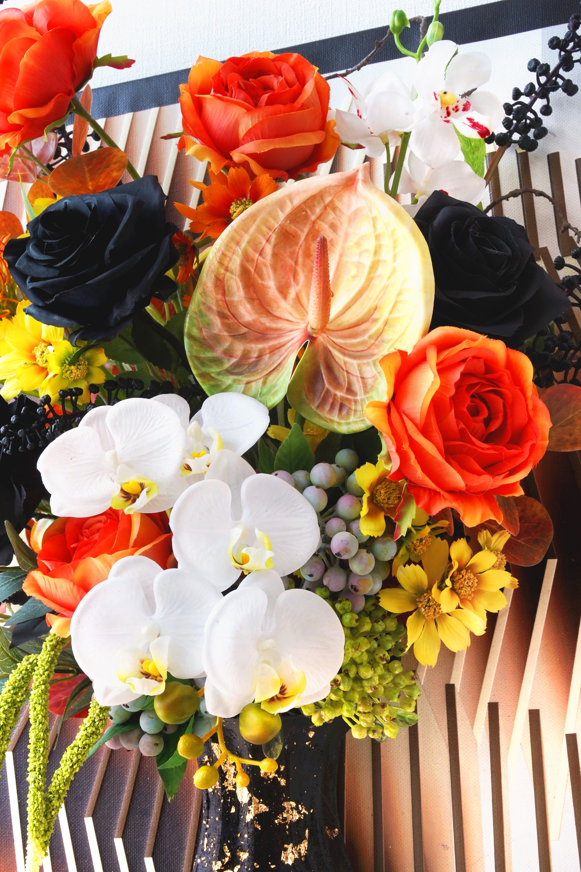 This sculptural masterpiece features an opulent collection of nature's finest: the timeless elegance of Roses, the sleek drama of Anthuriums, the delicate grace of Cosmos, and the exotic allure of Phalaenopsis and Vanda Orchids. They are artfully woven with the textural whispers of Eucalyptus, the bold statement of Leucospermum, and the playful charm of Berries, Mini Pumpkins, and Phytolacca. A touch of Amaranth adds a final note of fluid, organic movement.