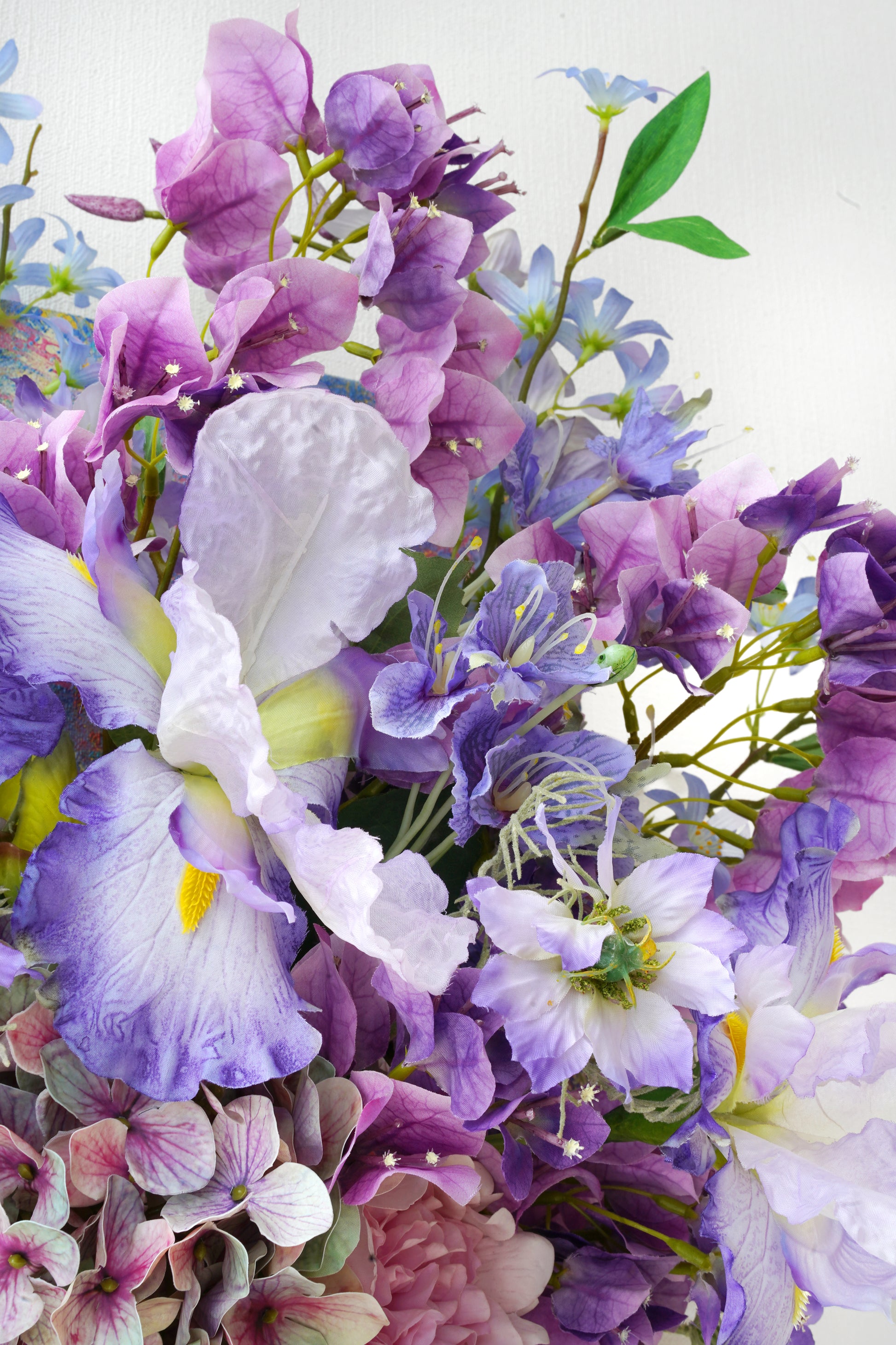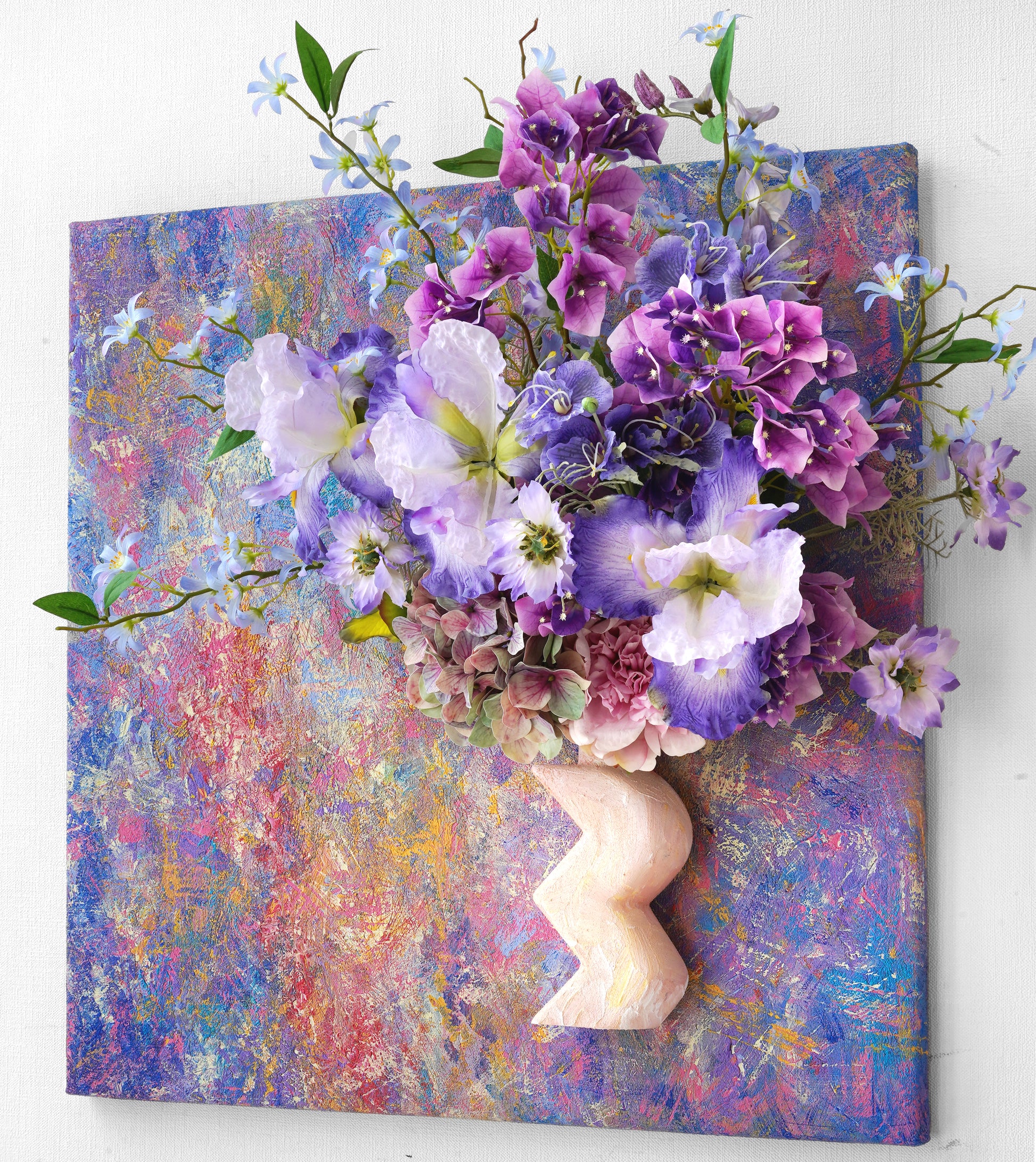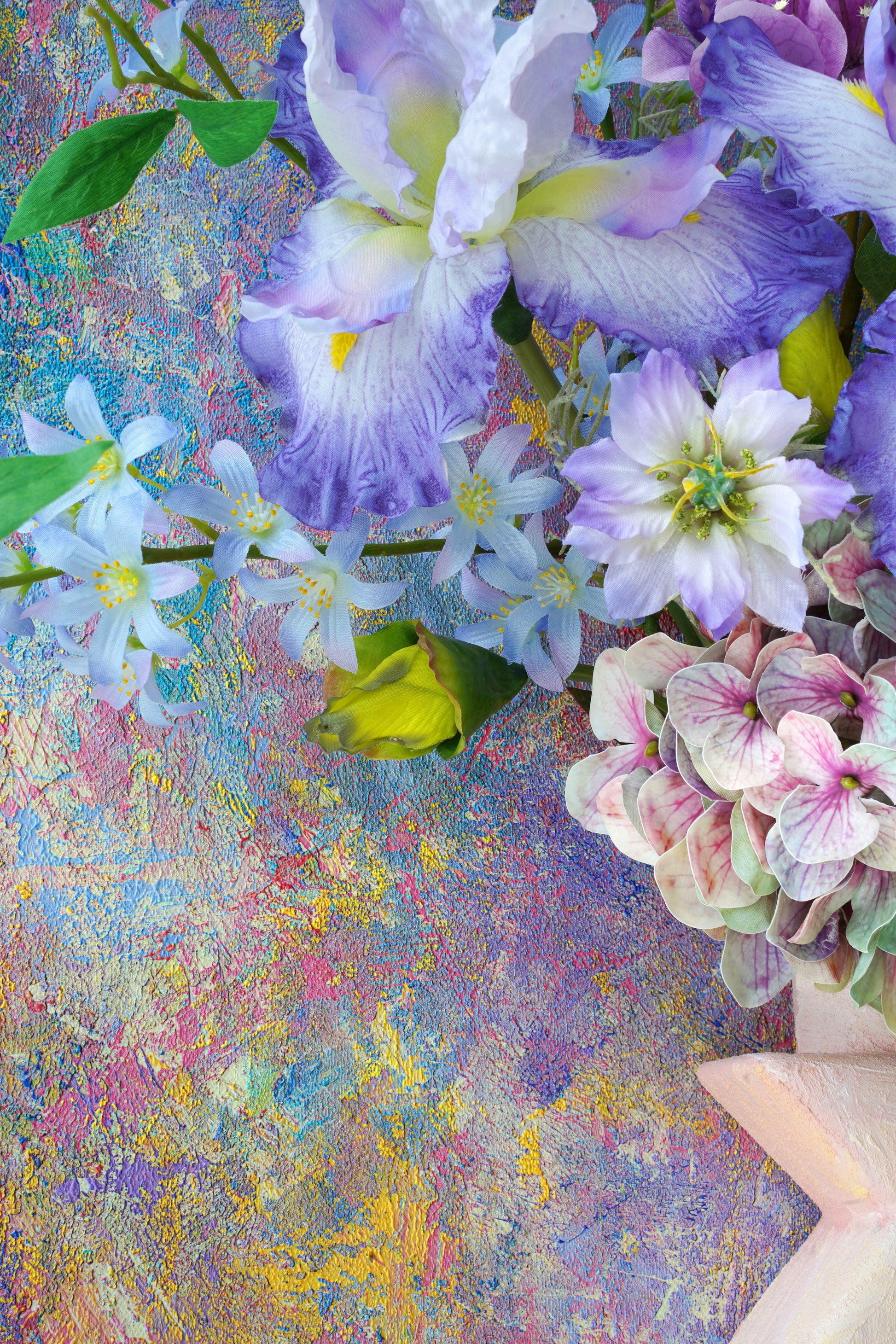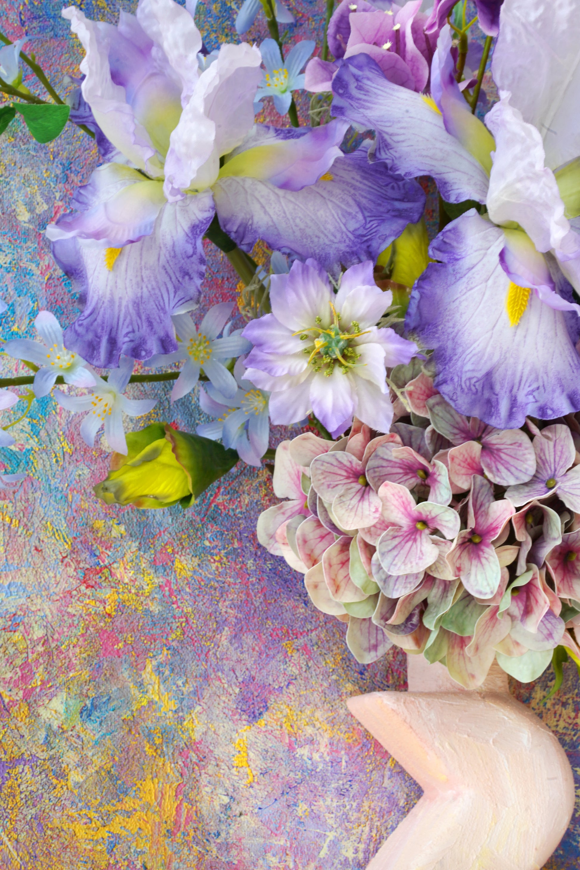 Into this tactile universe, we've woven a celestial garden: The wise gaze of the Iris, the vibrant clusters of Rhododendron, the dreamy clouds of Hydrangeas. The delicate, star-like Scabiosa dances alongside the soaring spires of Delphinium, while the humble Scilla peeks through like distant, twinkling stars.