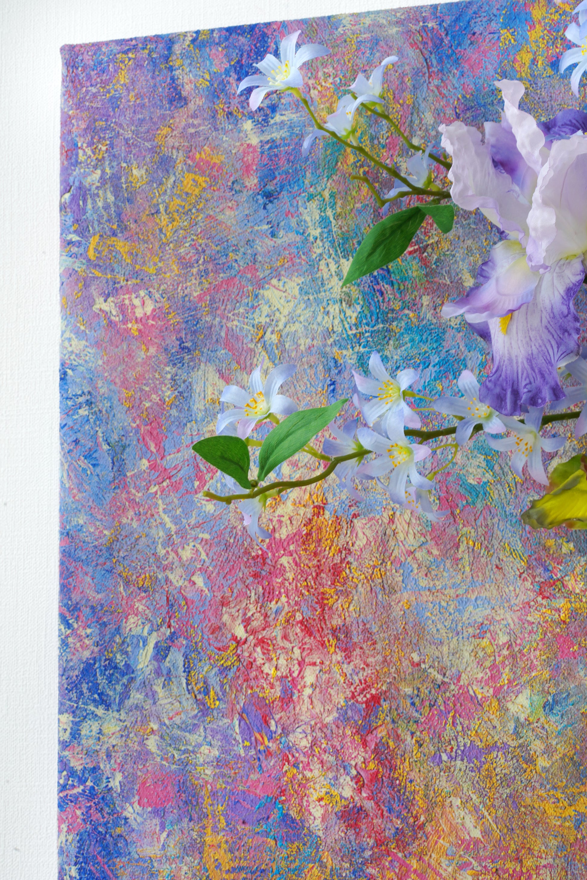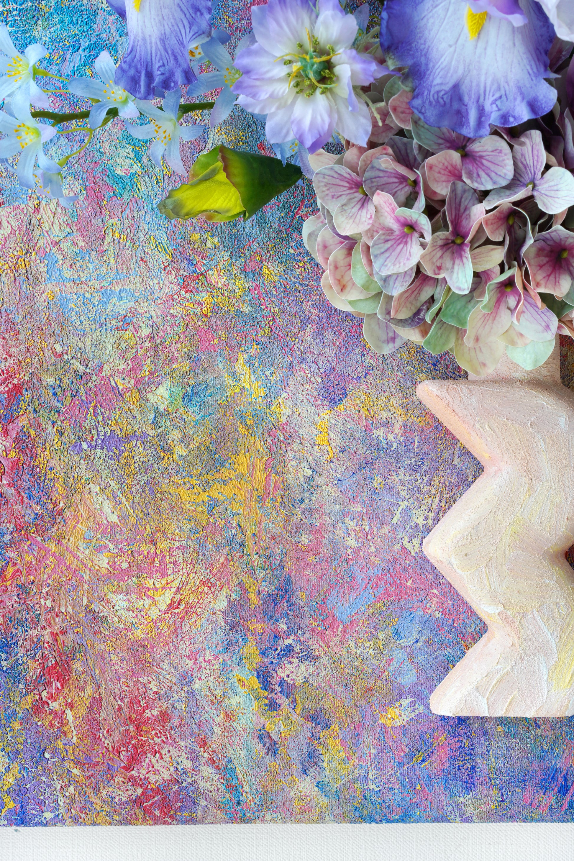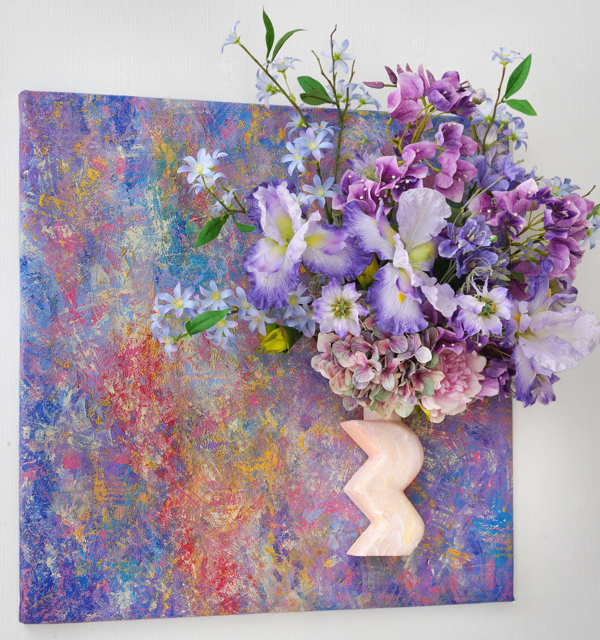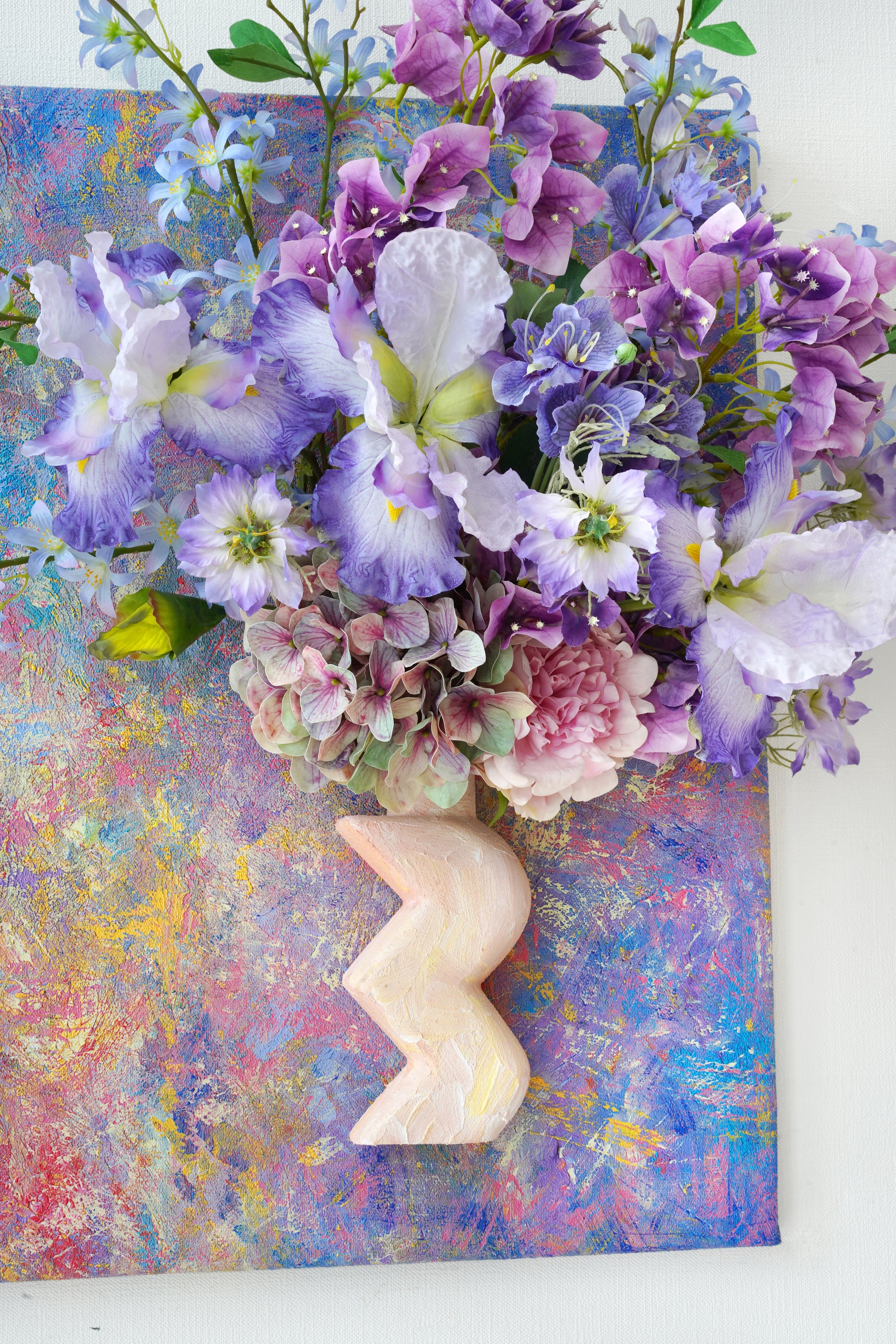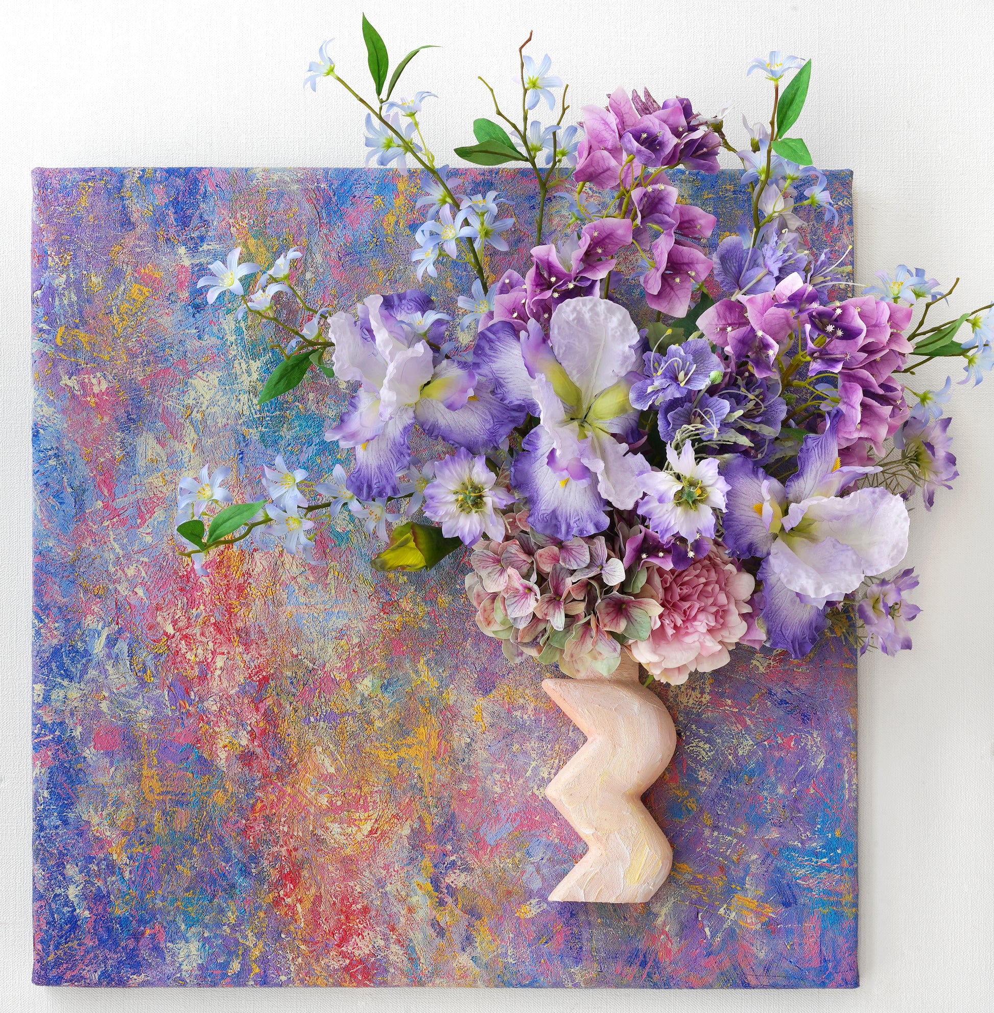 Into this tactile universe, we've woven a celestial garden: The wise gaze of the Iris, the vibrant clusters of Rhododendron, the dreamy clouds of Hydrangeas. The delicate, star-like Scabiosa dances alongside the soaring spires of Delphinium, while the humble Scilla peeks through like distant, twinkling stars.