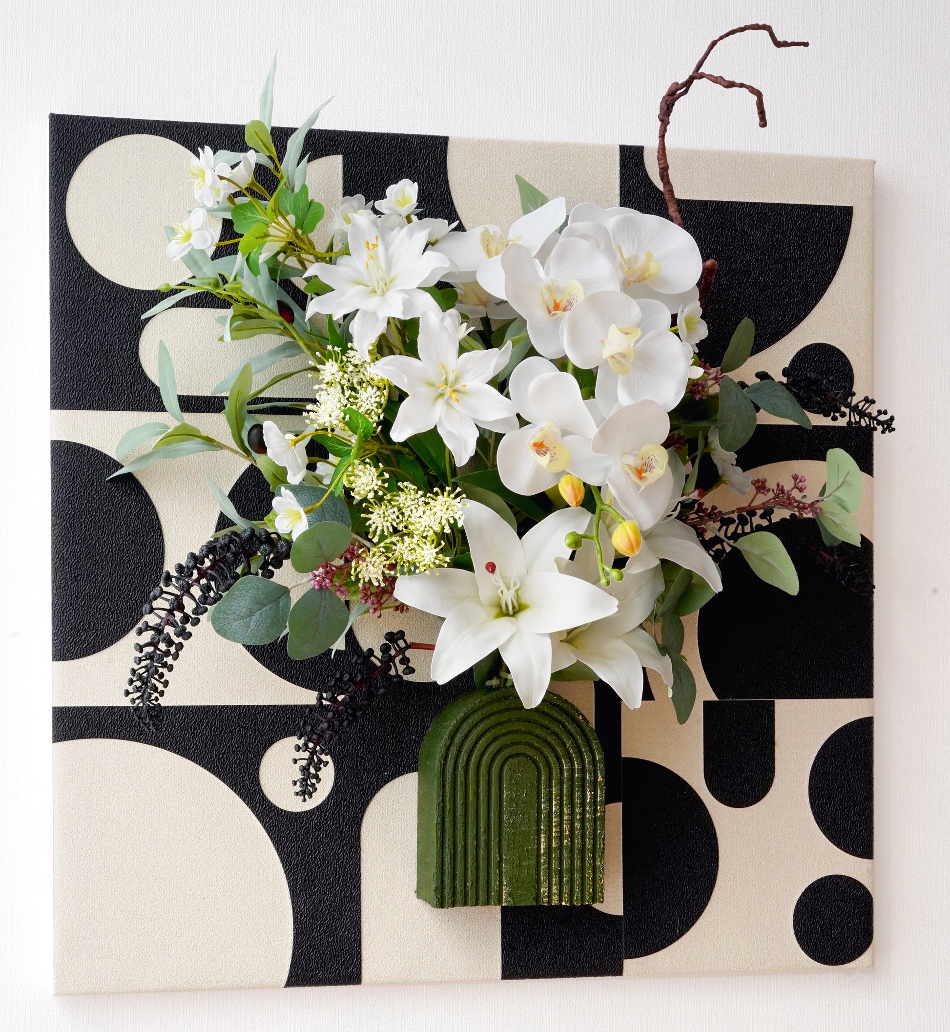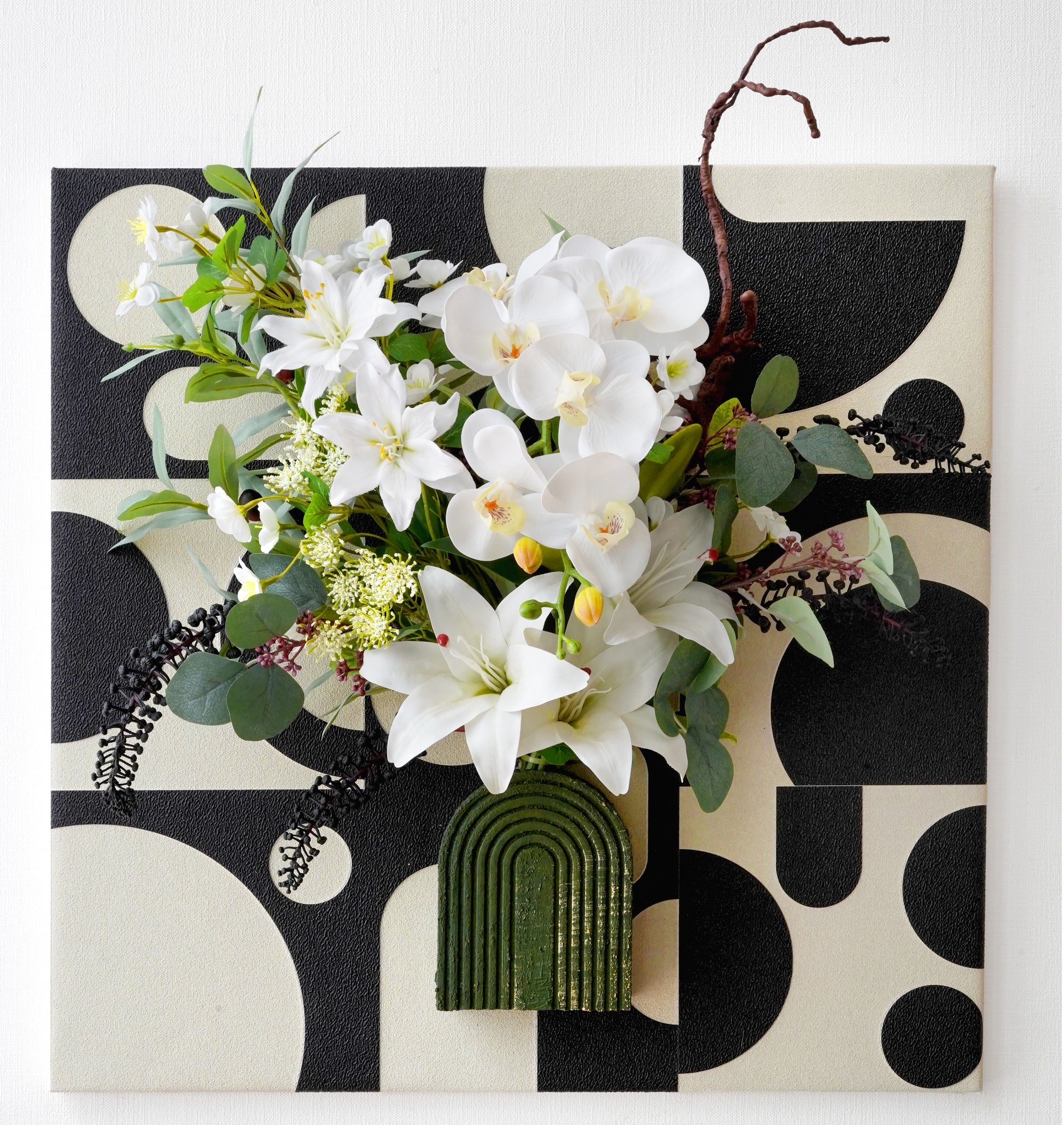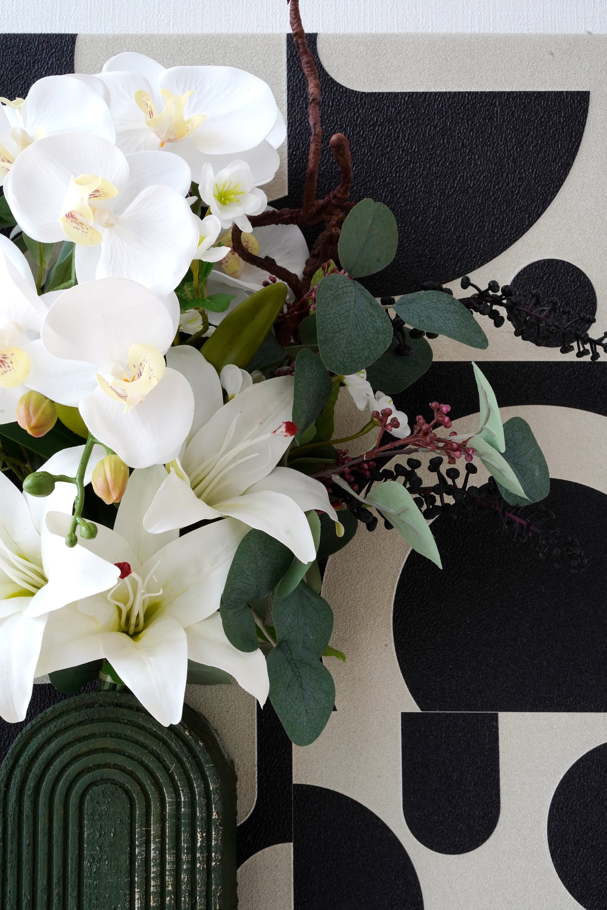 Step into a world of sculpted shadow and light. This captivating 3D wall art piece combines delicate Phalaenopsis orchids and Lilies with the structural beauty of Eucalyptus and Tree Branches. Accents of White Queen Anne's Lace and inky Black Pokeweed Berries create unexpected drama. Set against a modern backdrop of floating cream and black circles, this is more than floral art—it's a statement for the bold and sophisticated.