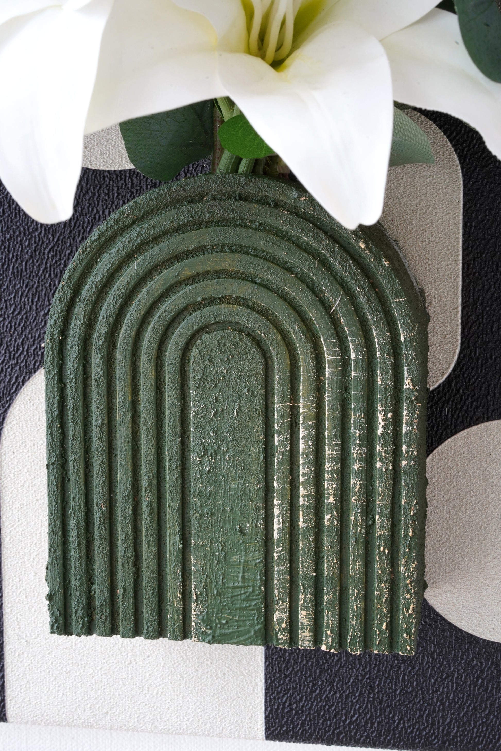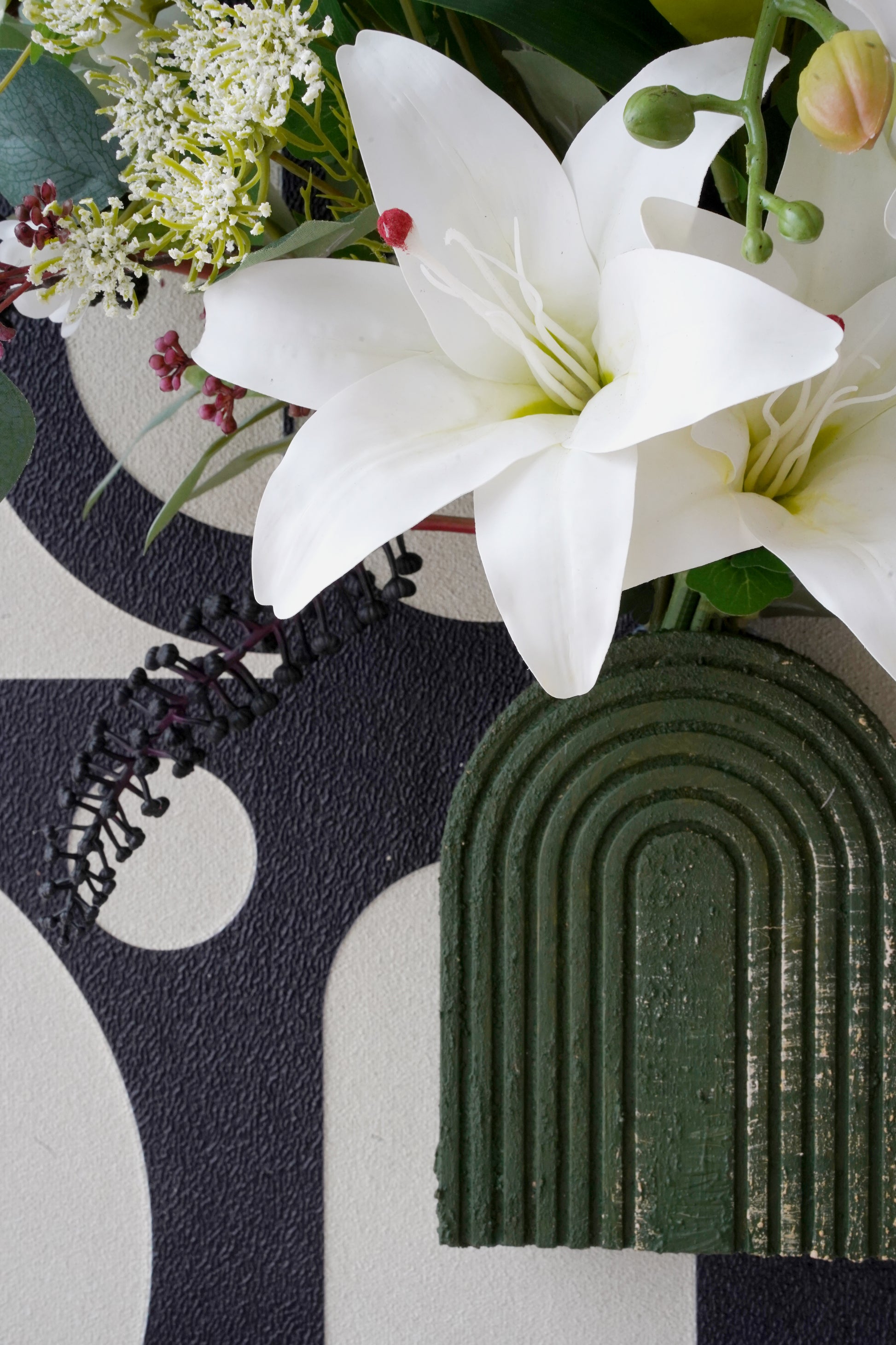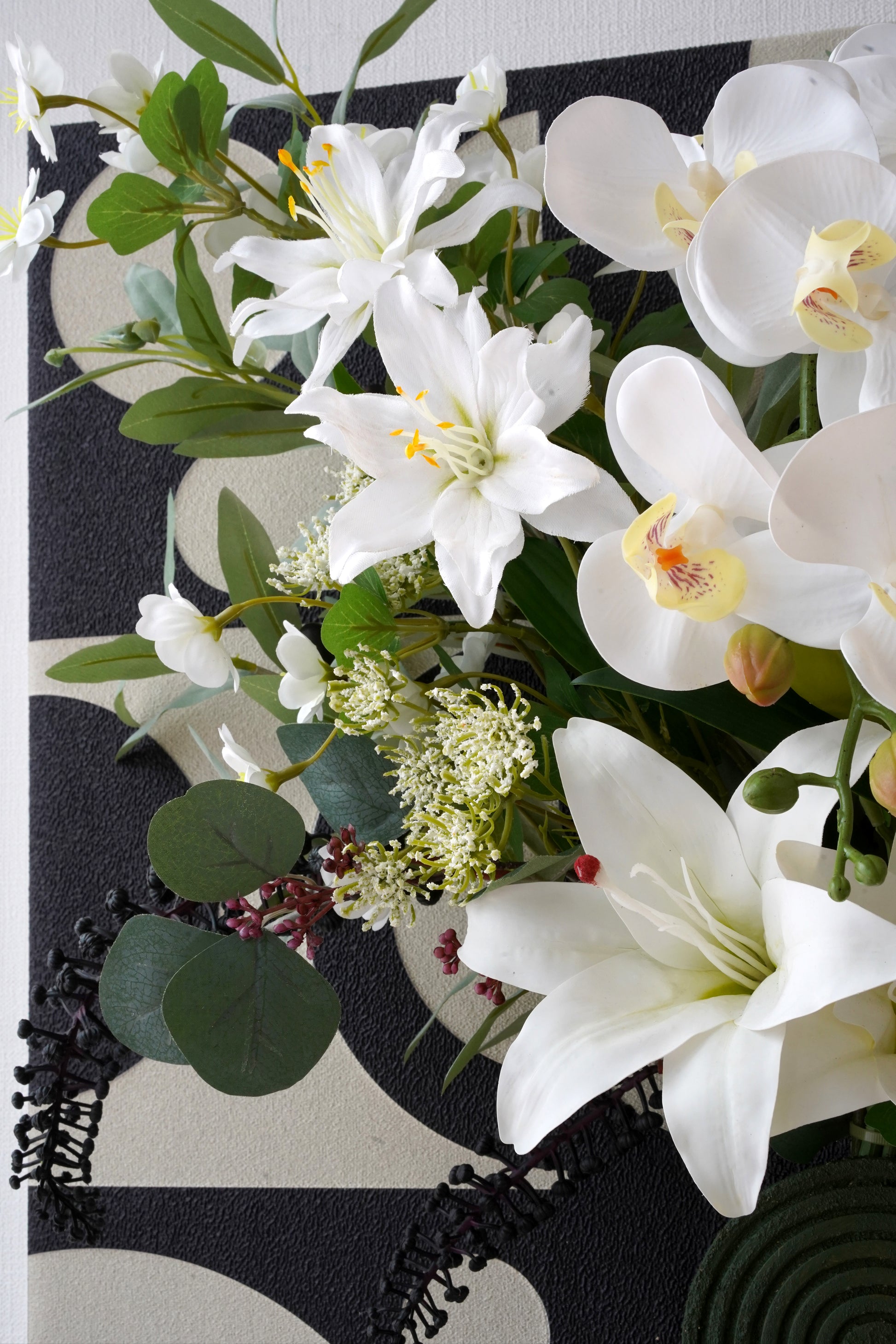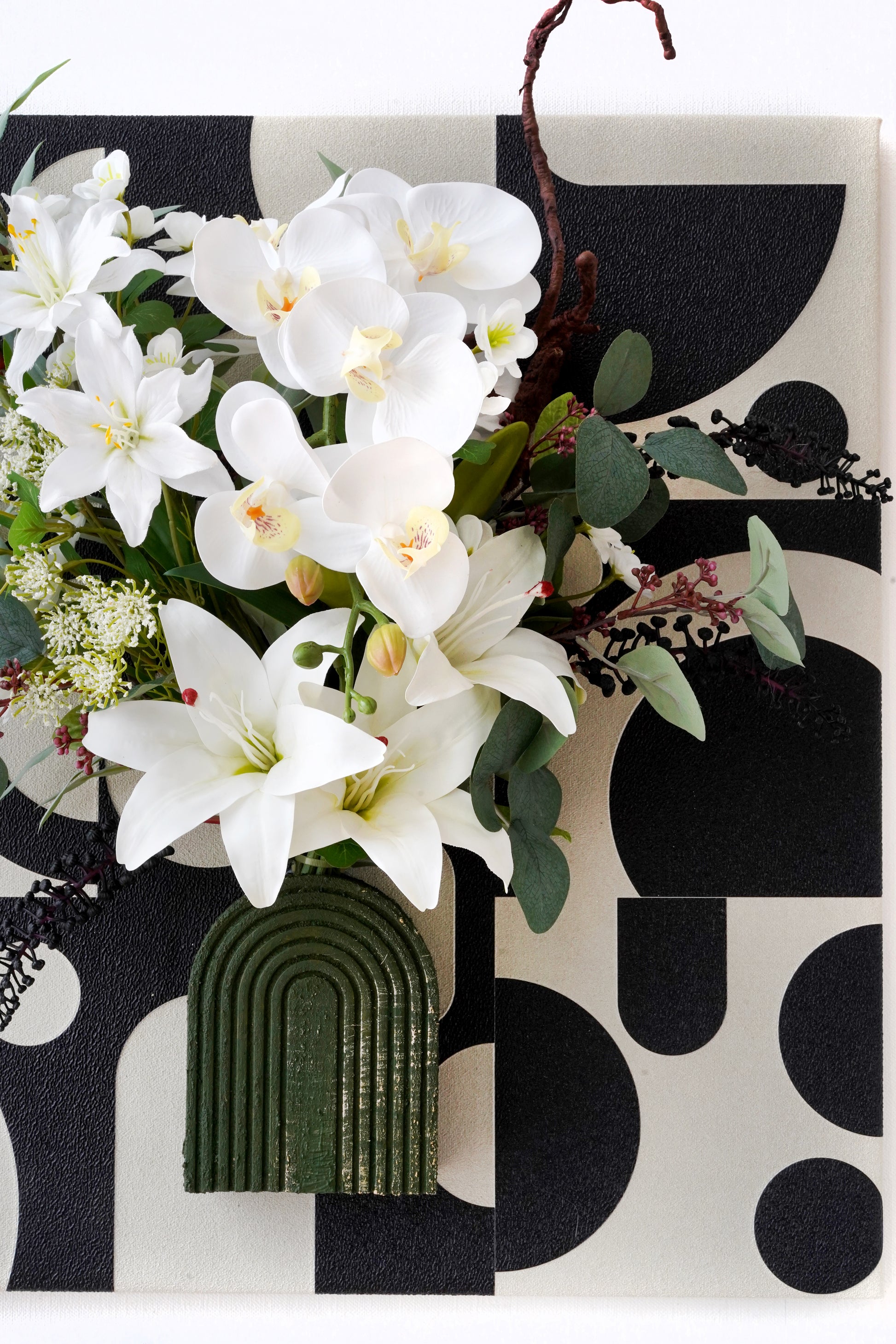 Step into a world of sculpted shadow and light. This captivating 3D wall art piece combines delicate Phalaenopsis orchids and Lilies with the structural beauty of Eucalyptus and Tree Branches. Accents of White Queen Anne's Lace and inky Black Pokeweed Berries create unexpected drama. Set against a modern backdrop of floating cream and black circles, this is more than floral art—it's a statement for the bold and sophisticated.