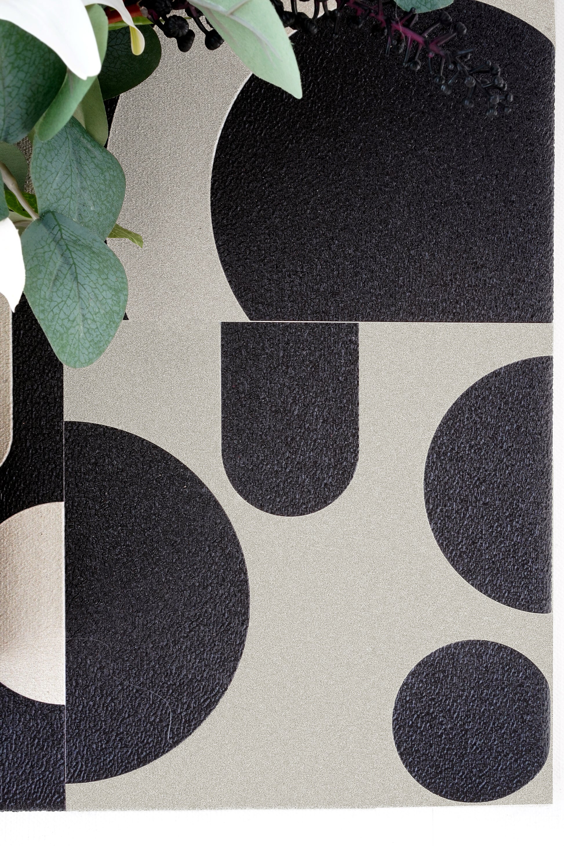 This meticulously arranged flora unfolds against a deeply textured backdrop inspired by modern graphics. Layers of matte black and soft cream form interlocking circles and flowing linear shapes, creating a sense of depth and movement that makes the botanicals appear to float in a serene, otherworldly landscape.