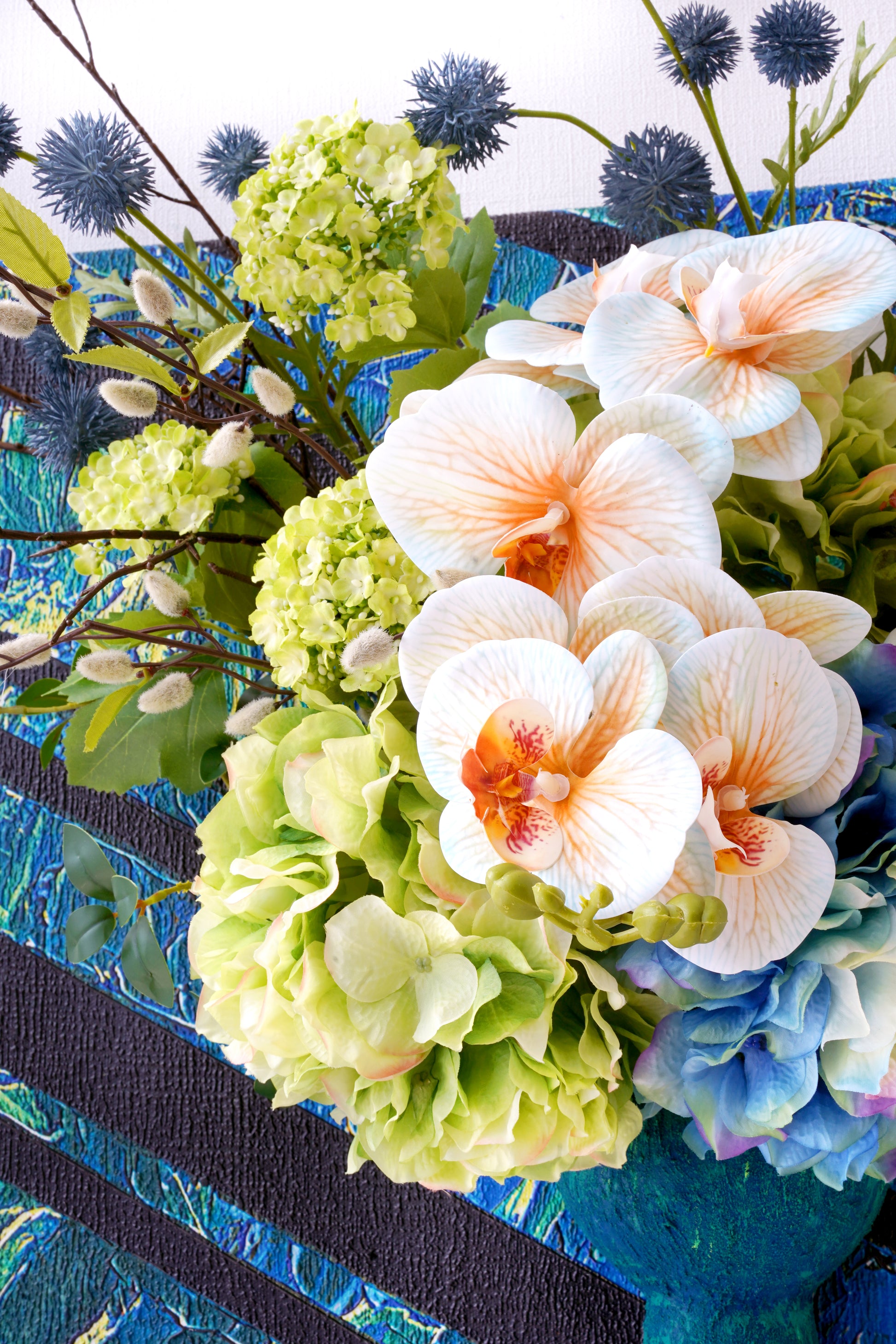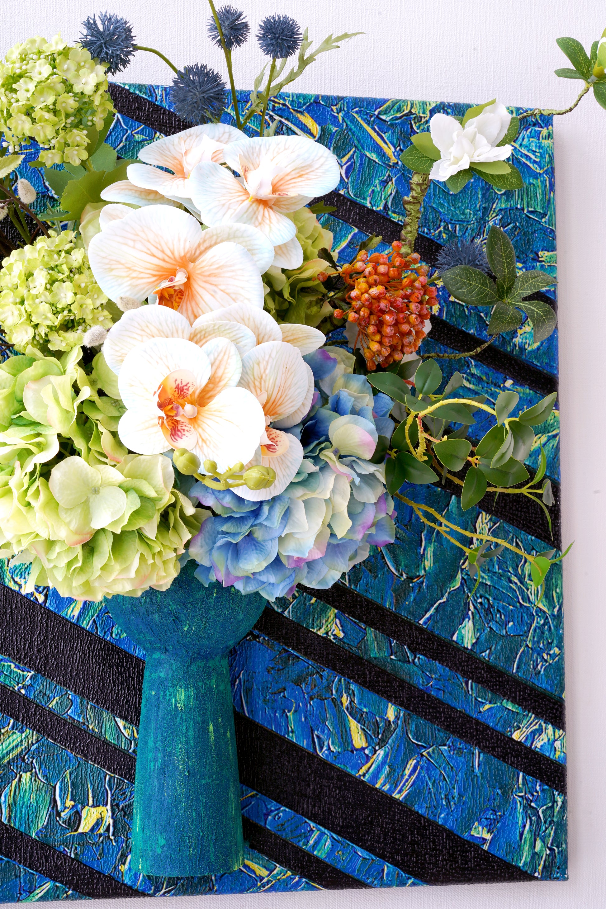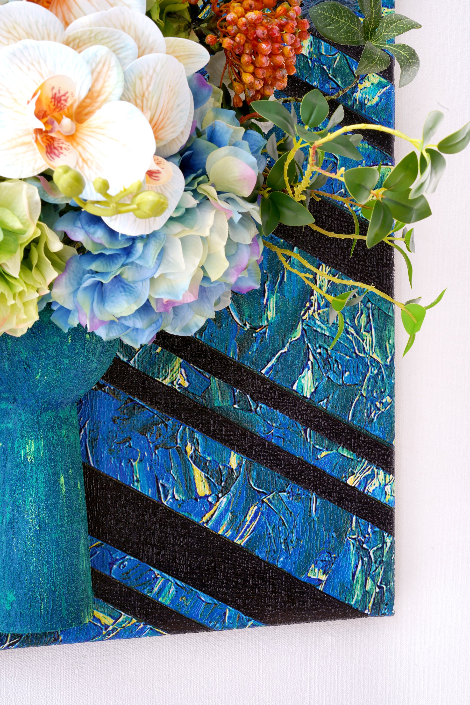 Our 3D wall art masterfully blends delicate Phalaenopsis orchids and lush Gardenia with textured Echinops and Pussy Willow. Set against a mesmerizing blue-to-green gradient with bold black stripes, this piece is a modern statement for a sophisticated space.