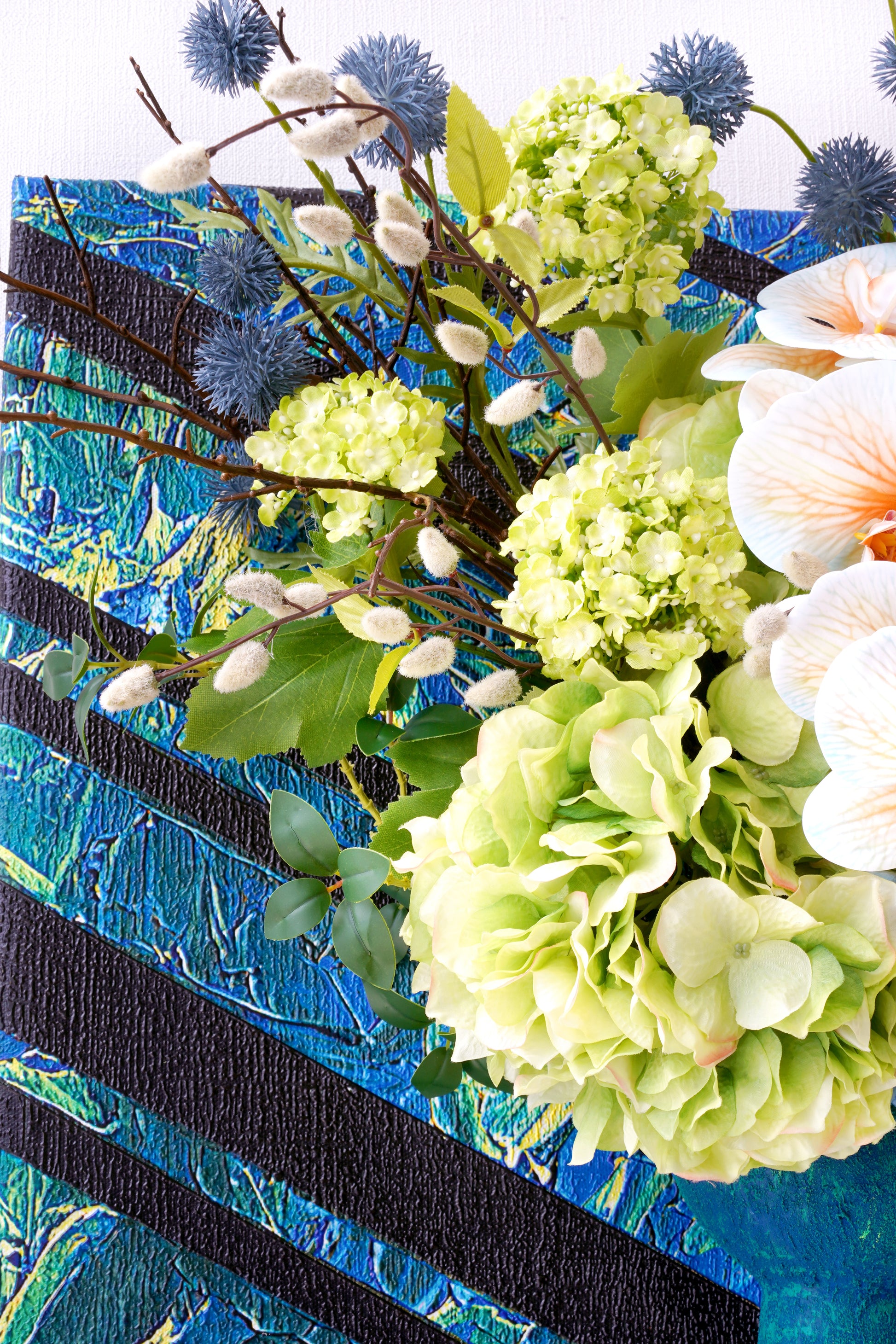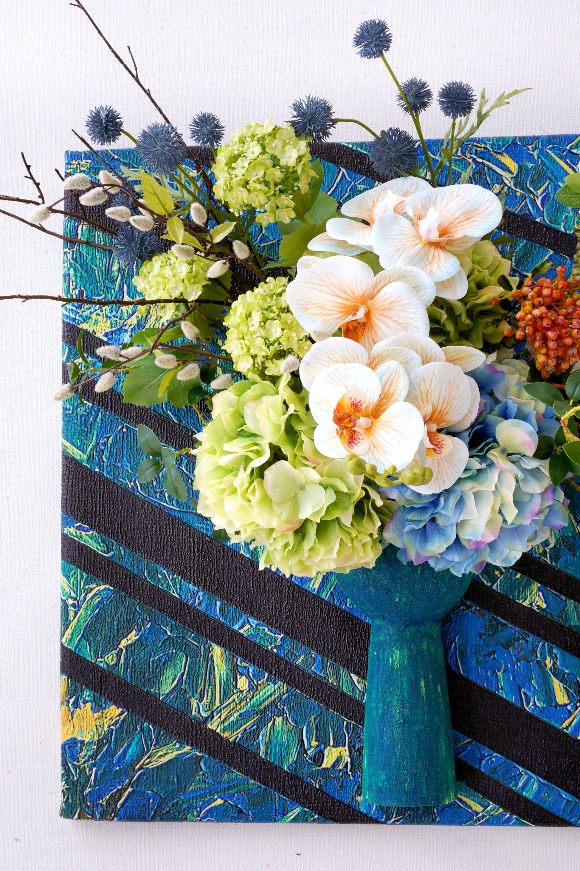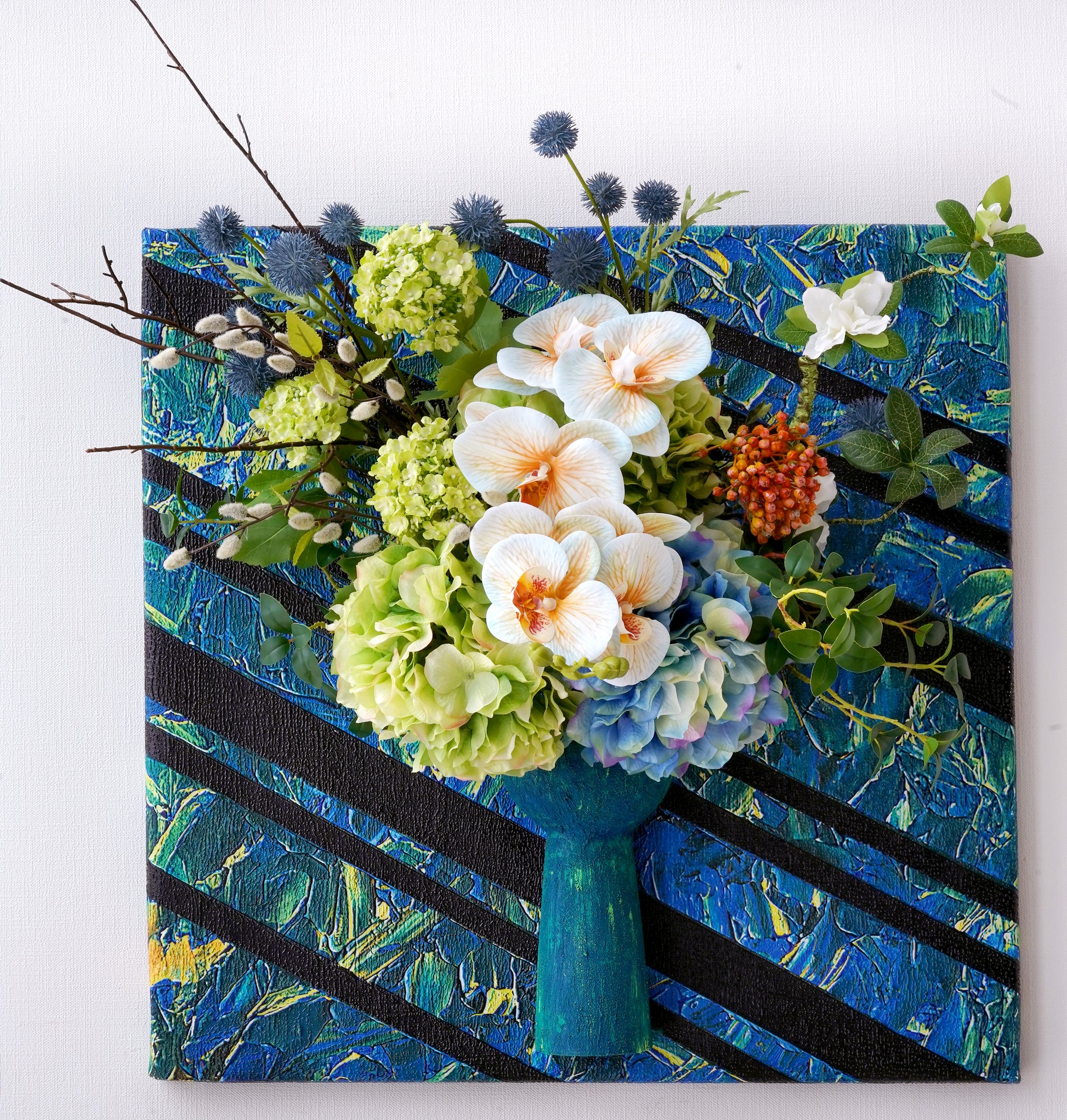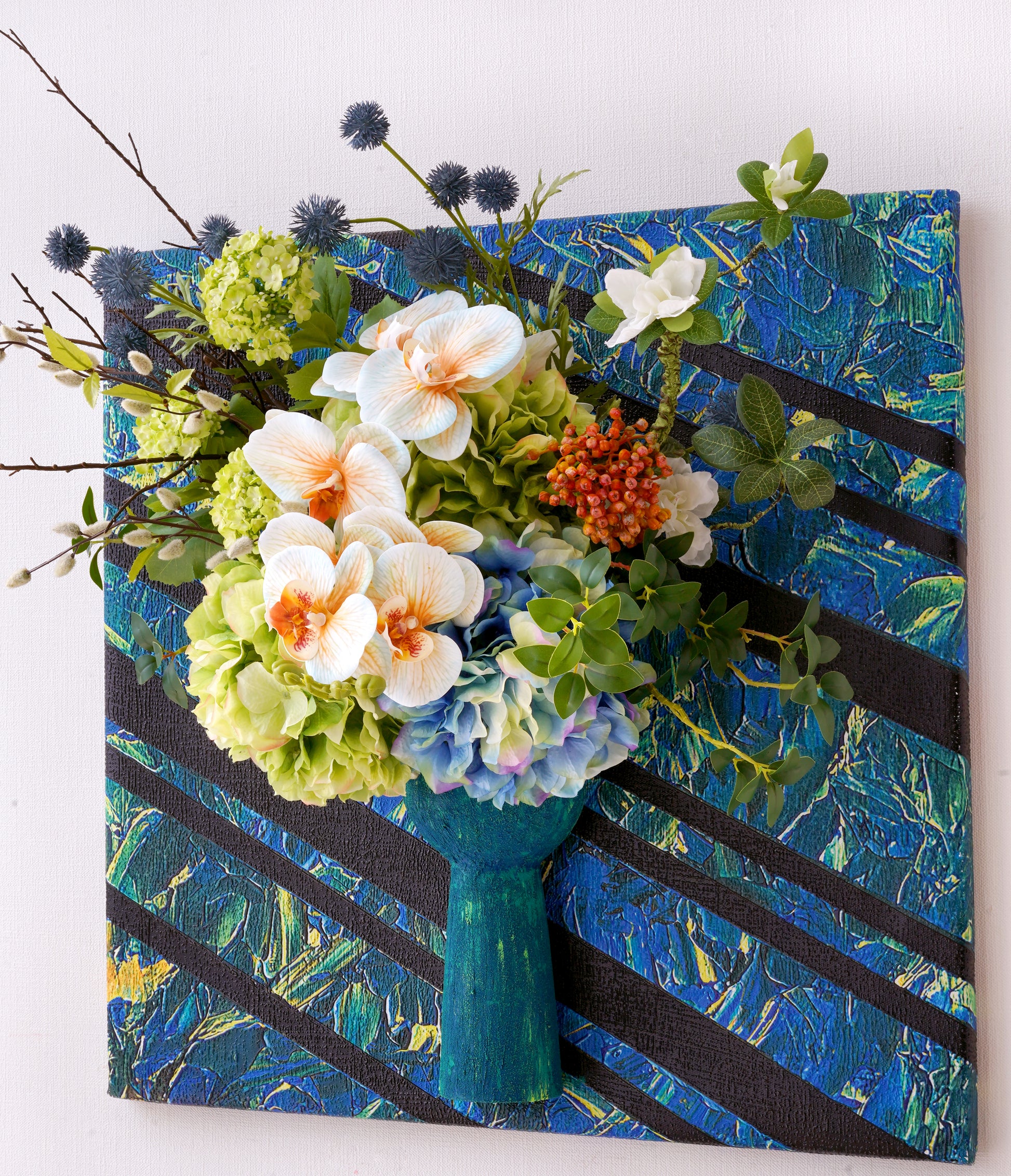 Our 3D wall art masterfully blends delicate Phalaenopsis orchids and lush Gardenia with textured Echinops and Pussy Willow. Set against a mesmerizing blue-to-green gradient with bold black stripes, this piece is a modern statement for a sophisticated space.