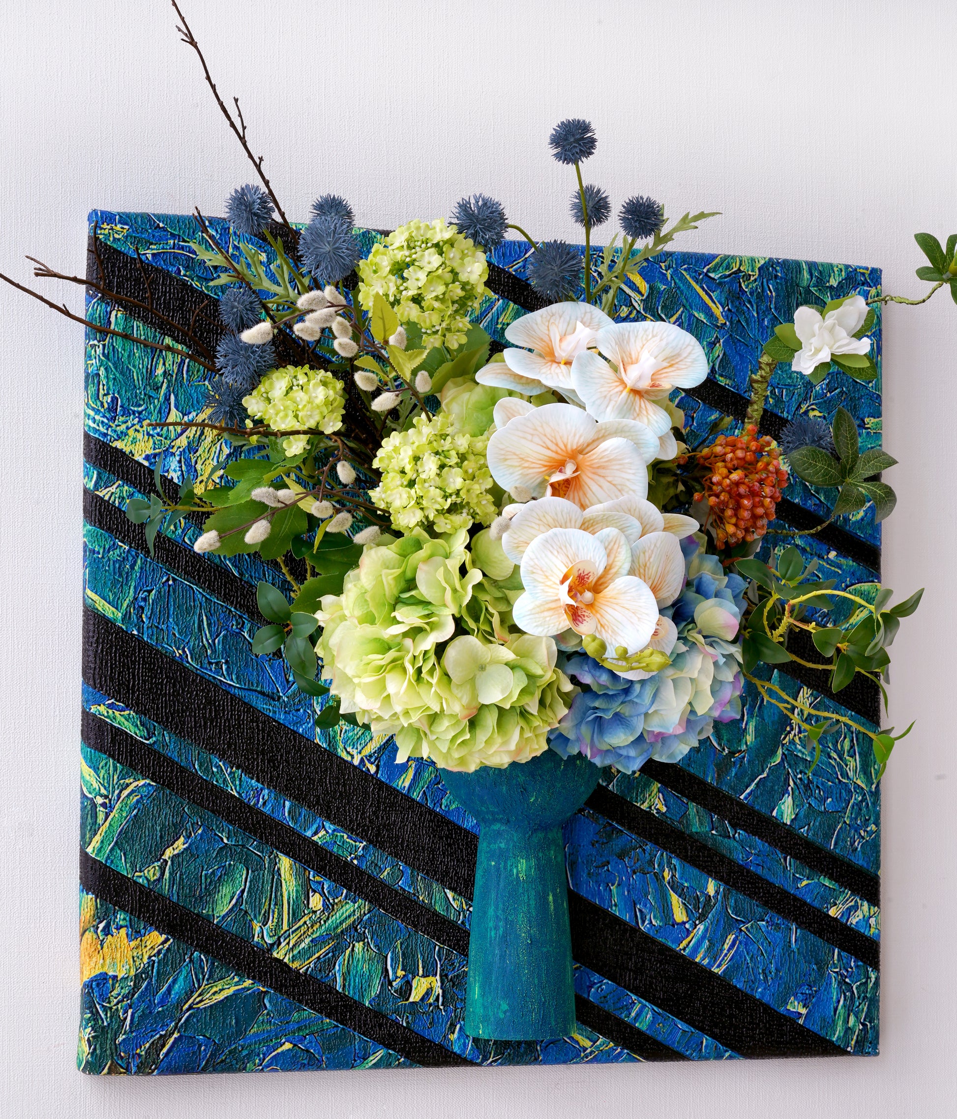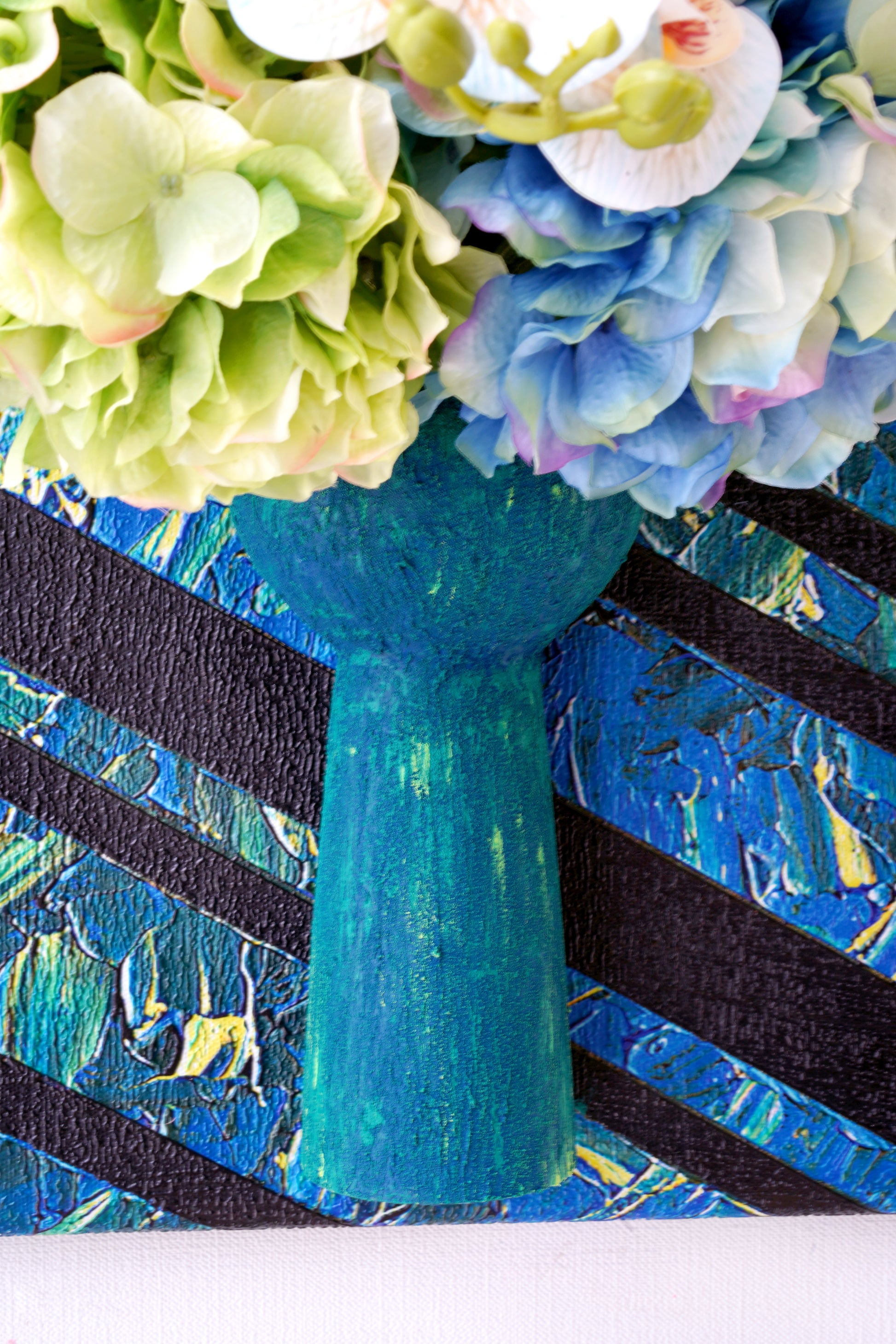 Dare to be different? Framed by a bold, contemporary background of black stripes over a serene blue-green hued, this piece is a study in contrast—both soft and structural, organic and modern.