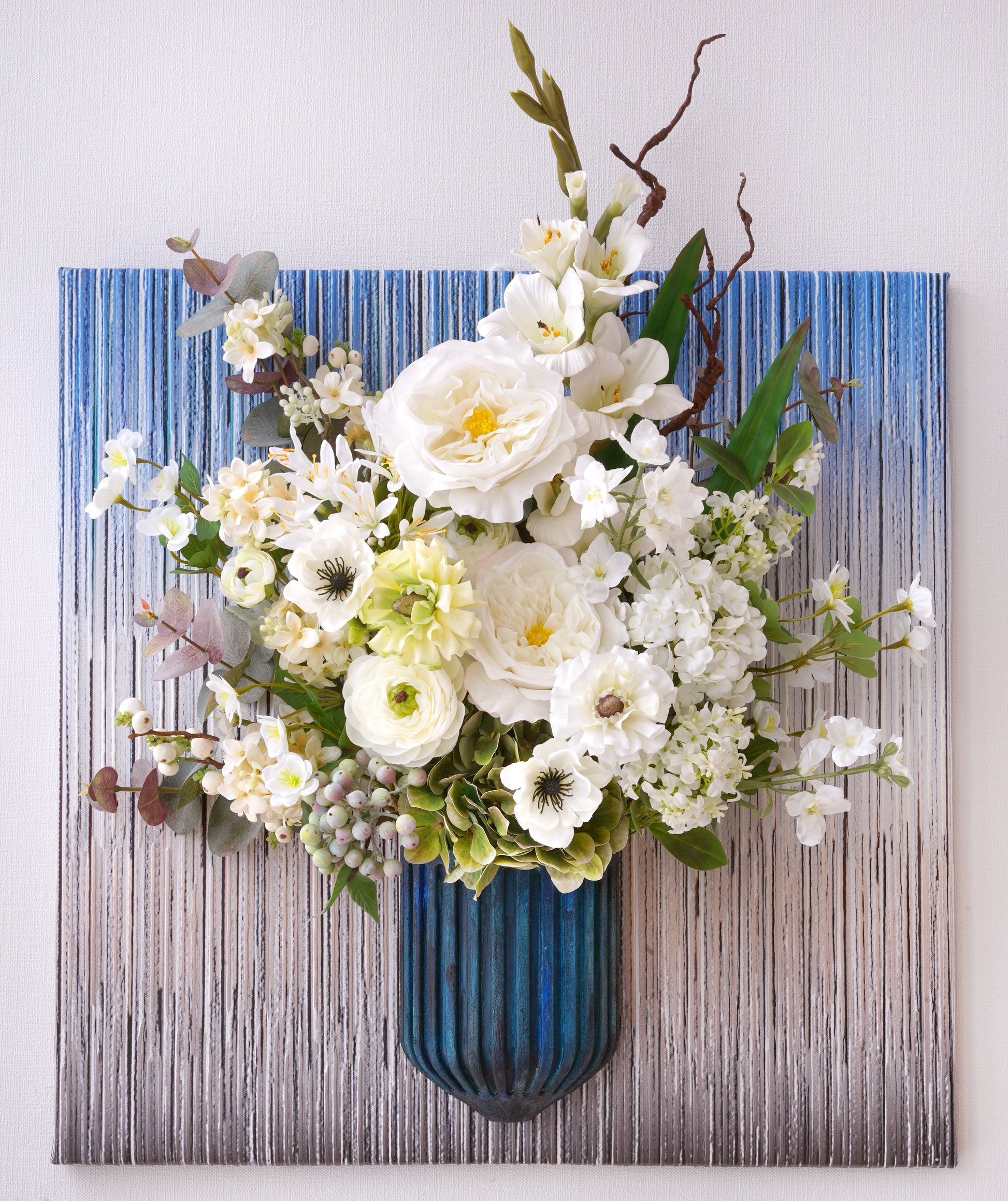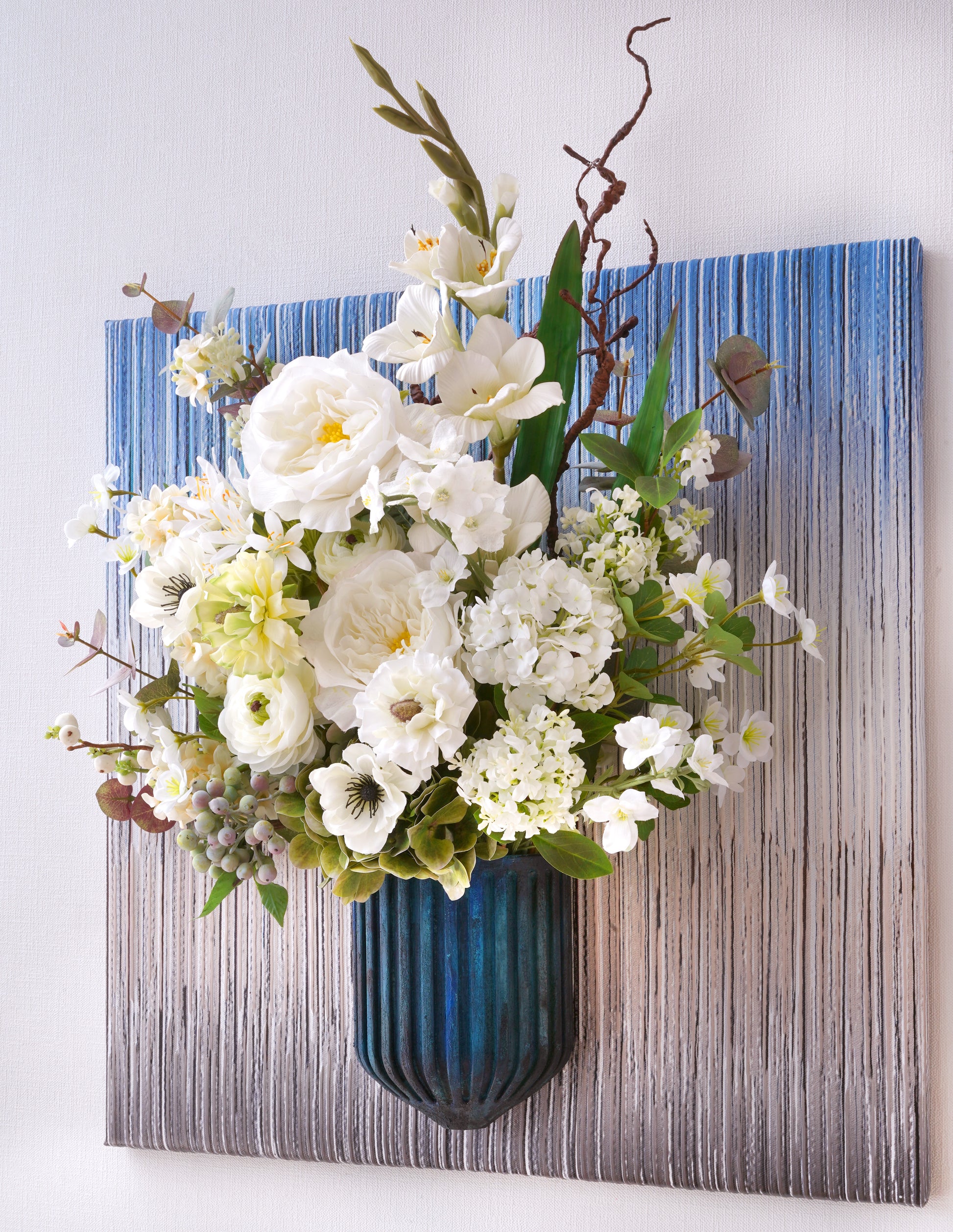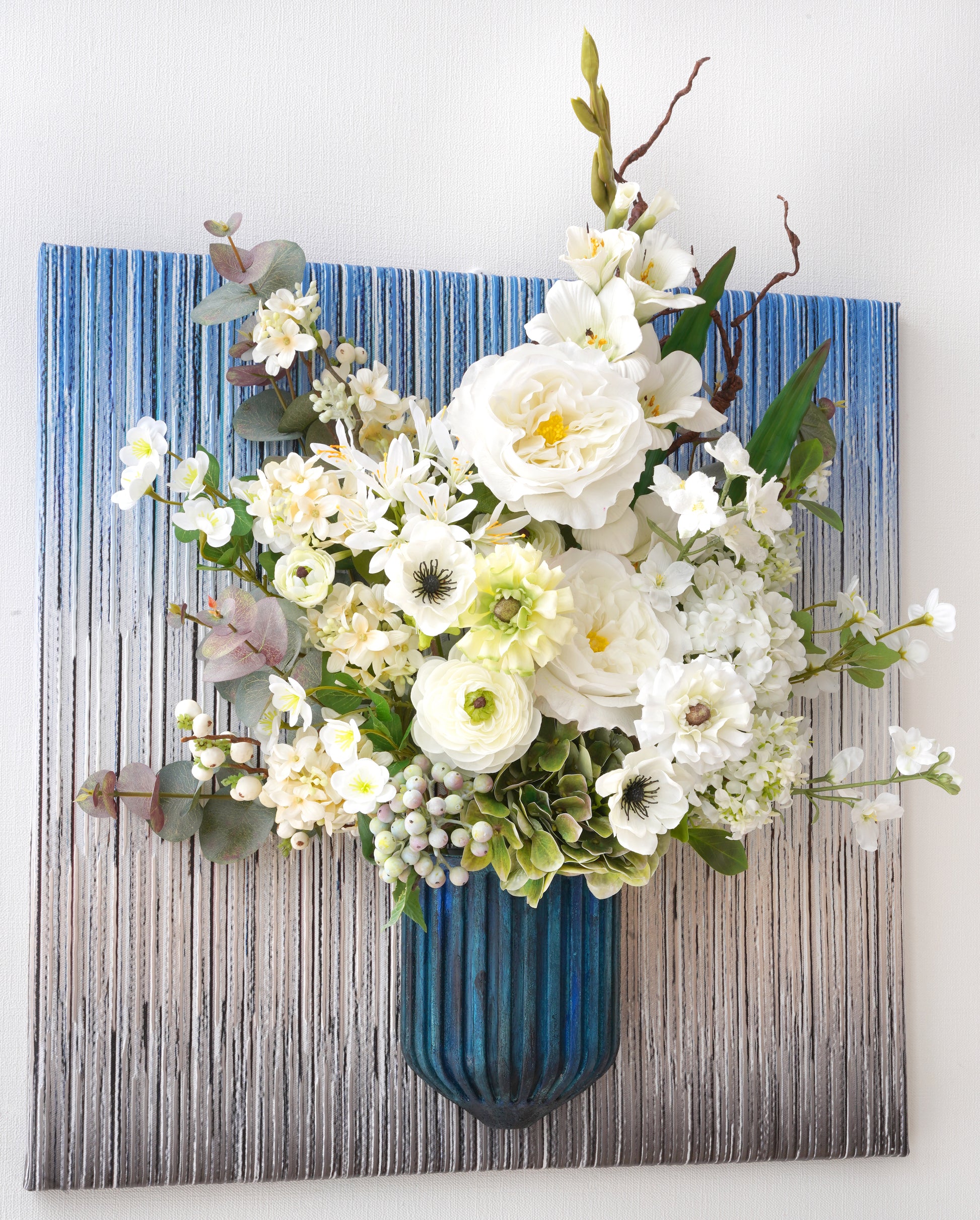 Discover the art of organic modernism with our breathtaking 3D floral wall art. Featuring an enchanting mix of Garden Rose, Agapanthus, Sword Lilies, Tree Branch, Anemone, Ranunculus, Hydrangeas, Berries and Euculapoytus, this piece is a living sculpture. Set against a backdrop of layered blues and earthy brown vertical stripes, it brings depth, texture, and serene beauty to any space.