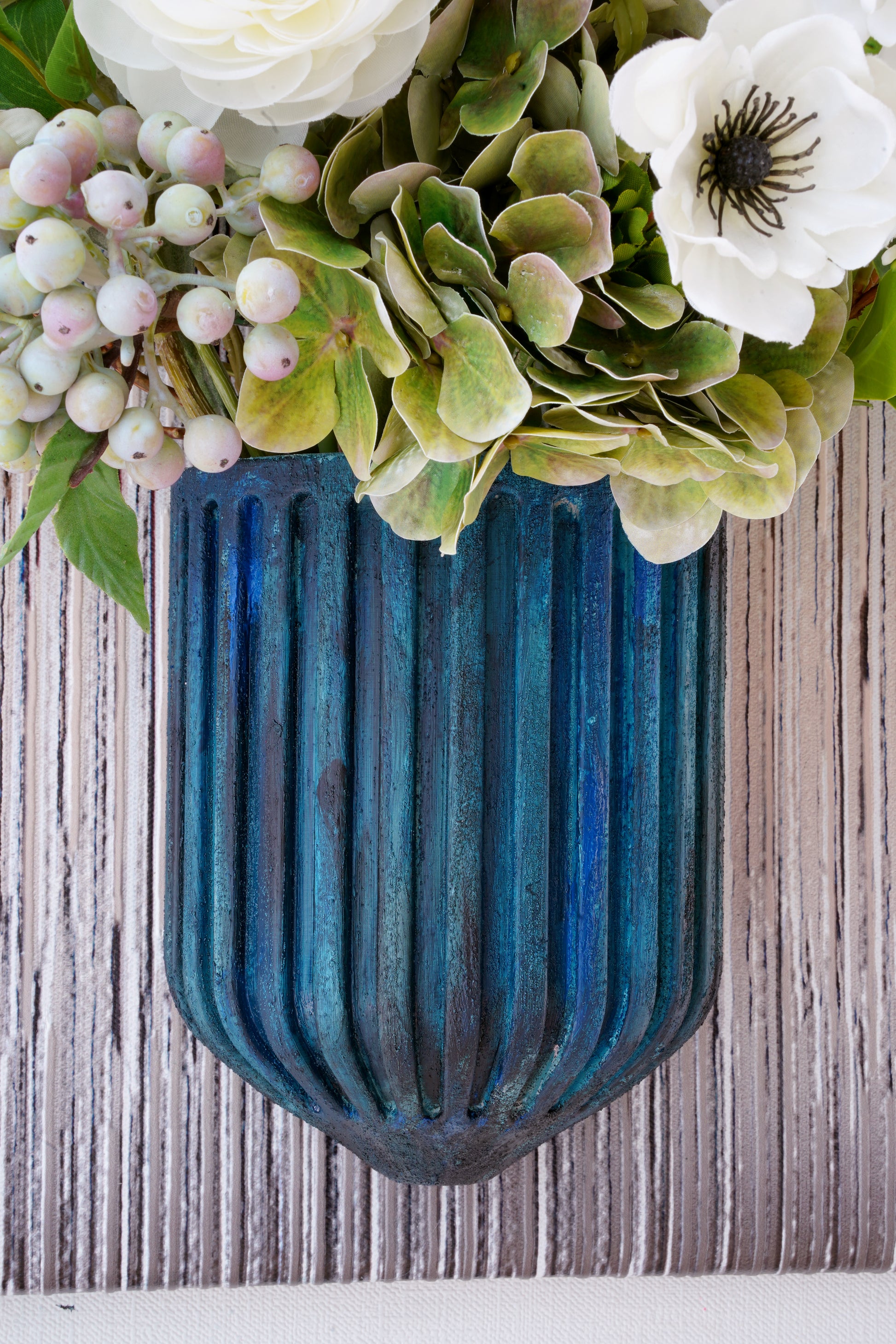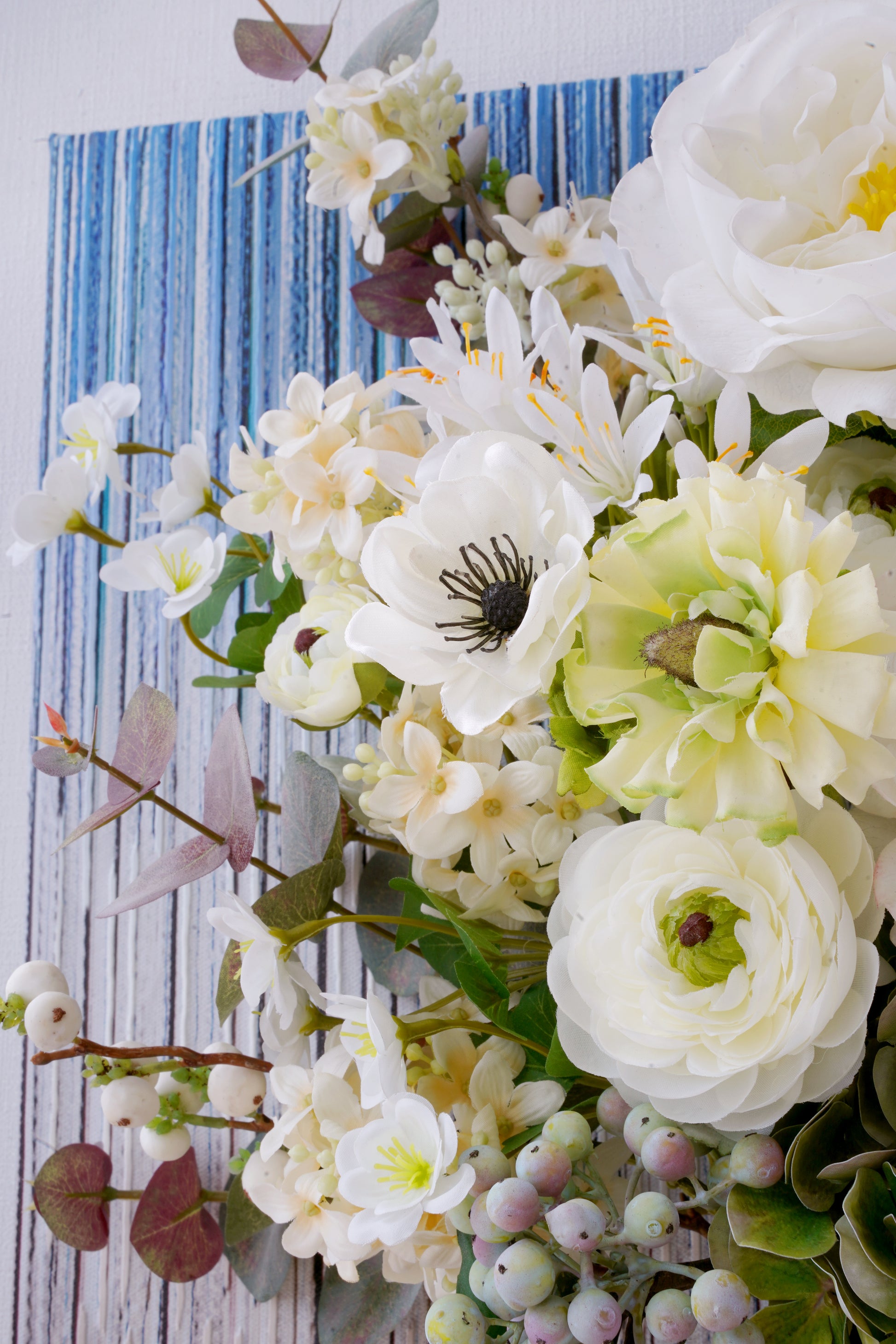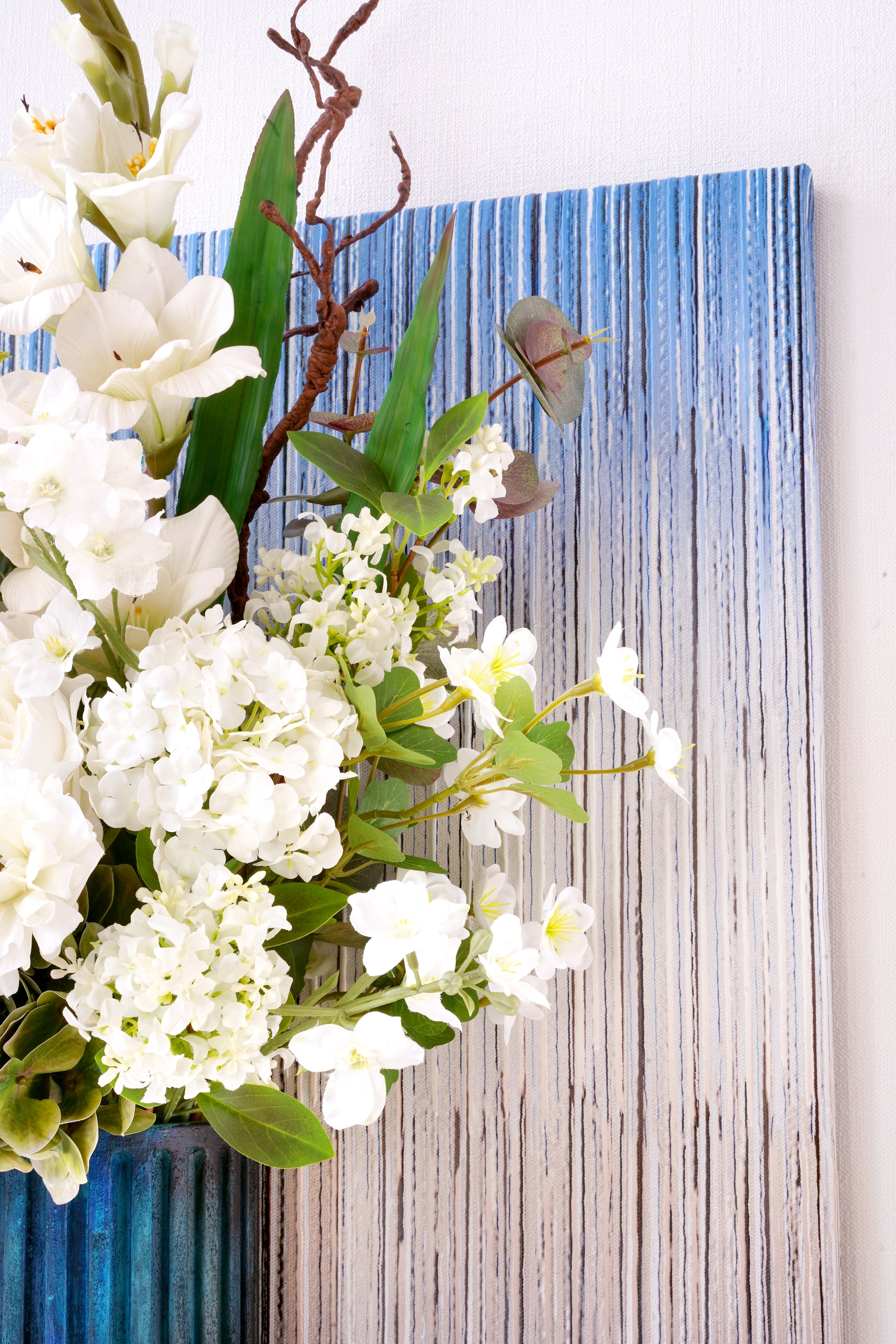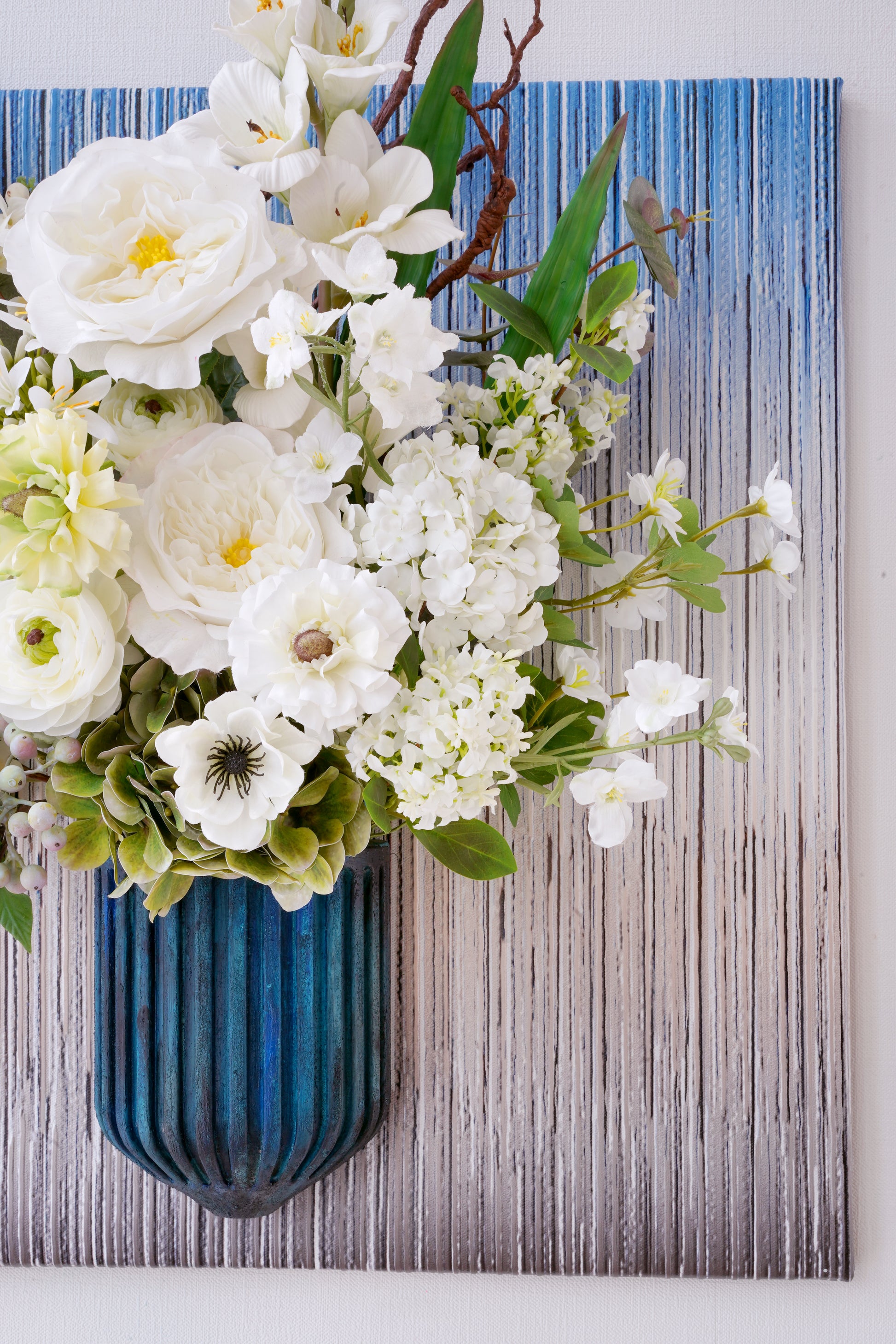 Discover the art of organic modernism with our breathtaking 3D floral wall art. Featuring an enchanting mix of Garden Rose, Agapanthus, Sword Lilies, Tree Branch, Anemone, Ranunculus, Hydrangeas, Berries and Euculapoytus, this piece is a living sculpture. Set against a backdrop of layered blues and earthy brown vertical stripes, it brings depth, texture, and serene beauty to any space.
