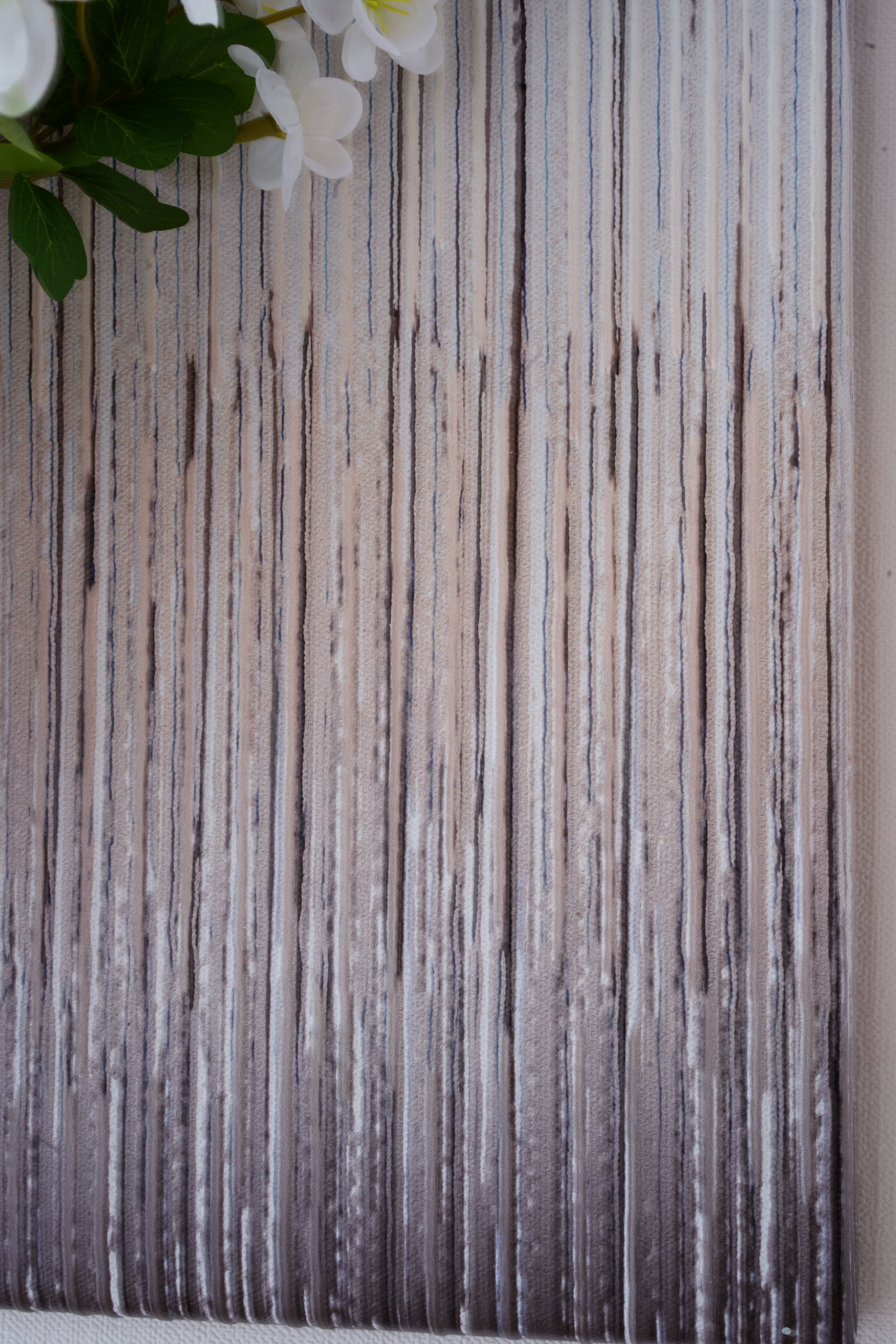 The inspiration draws from the serene depths of a sky, realized through a sophisticated palette of layered blues and rich, brown vertical stripes. This unique background creates a stunning sense of depth and movement, making the delicate flowers appear to float in a timeless, three-dimensional space.