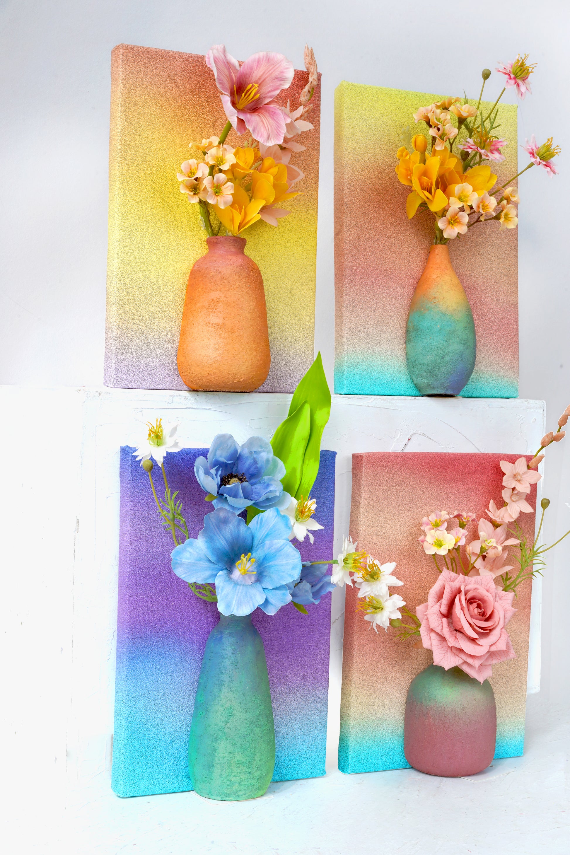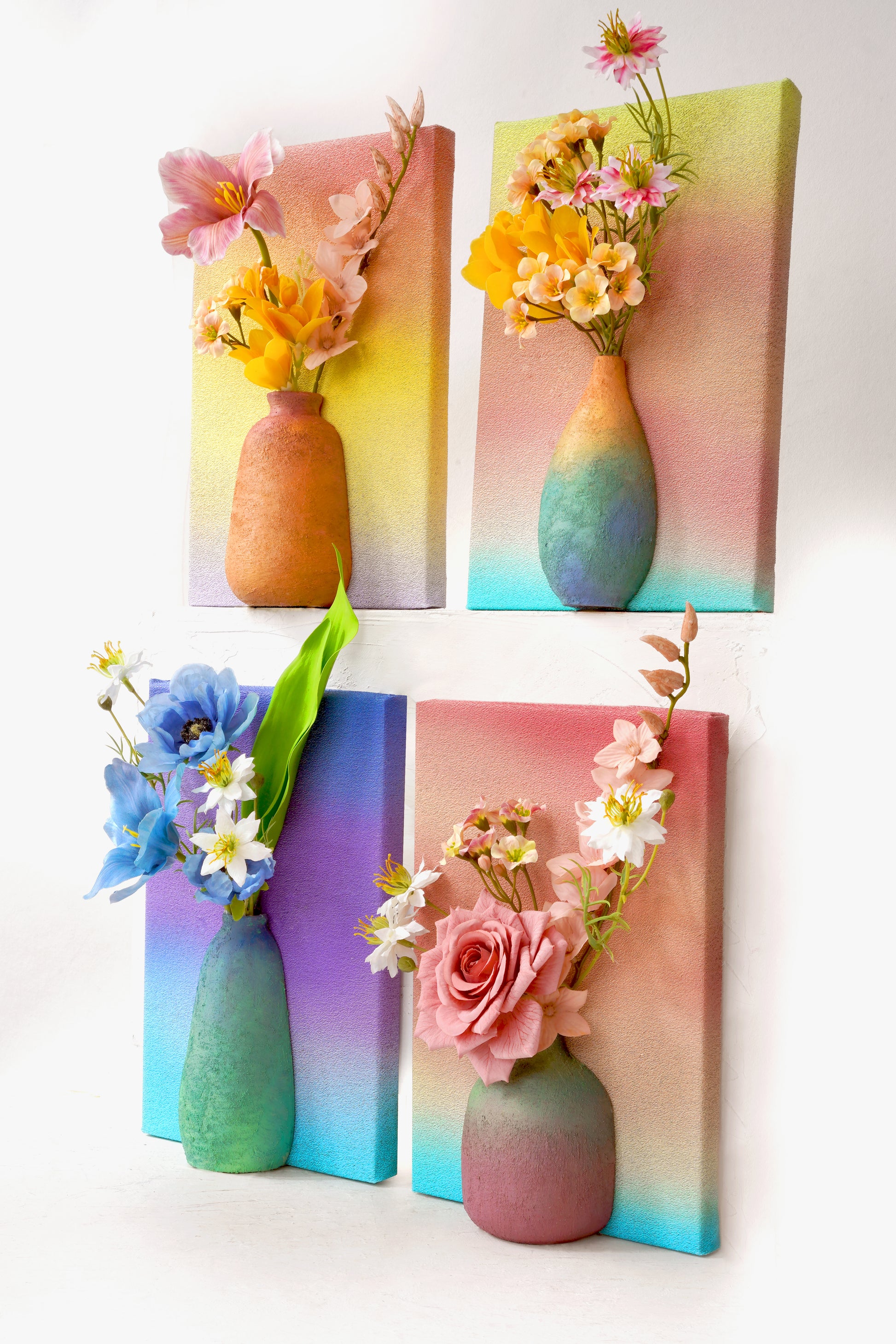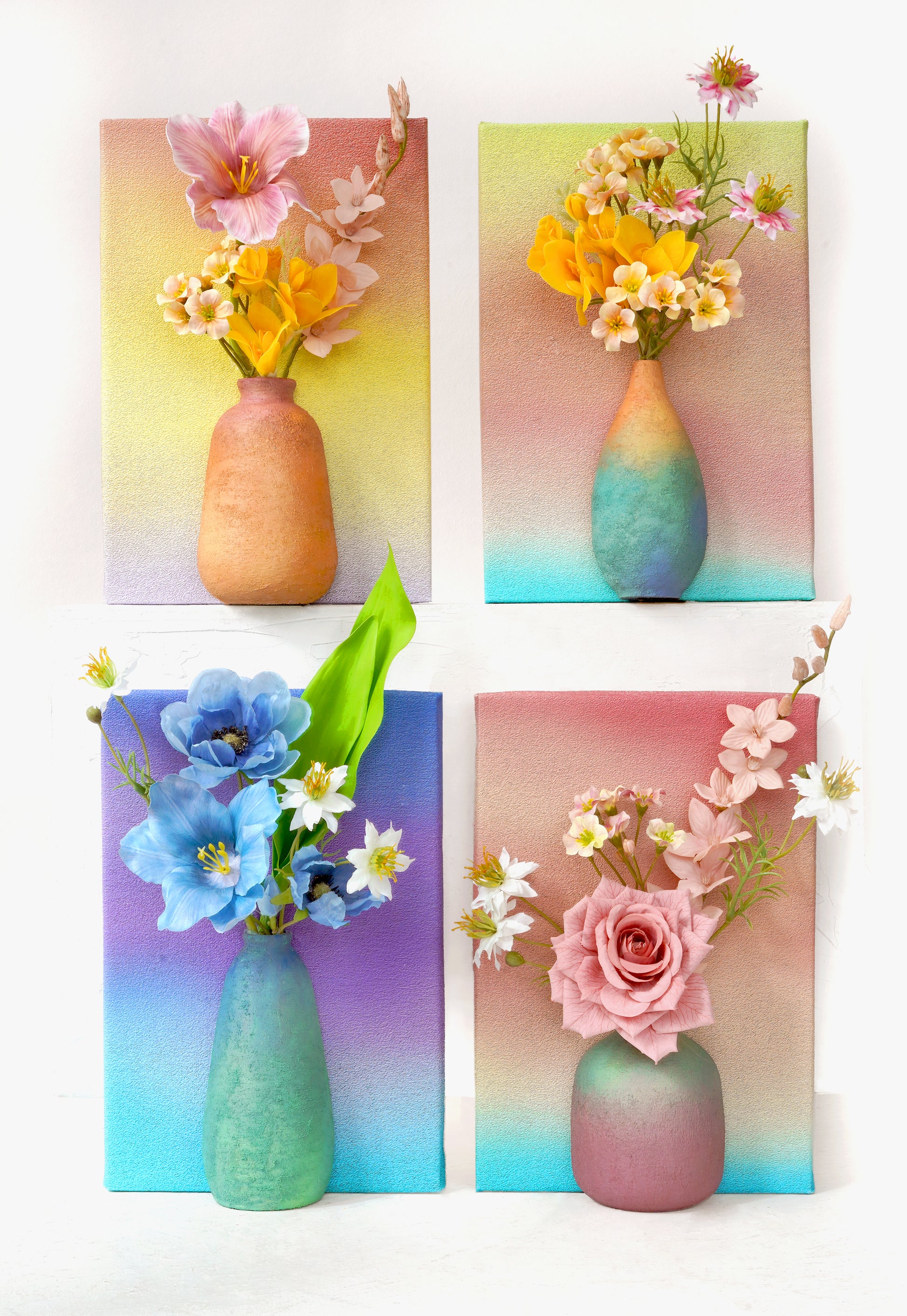 Bring the tranquility and beauty of a spring garden into your home with our Canvas Wall Art Set. This unique collection features four vertical canvases, each adorned with a gracefully painted vase and a delicate arrangement of artificial flowers that seem to spring forth from the surface. The soft pastel backgrounds blend seamlessly from one canvas to the next, creating a soothing gradient that enhances any room's decor.
